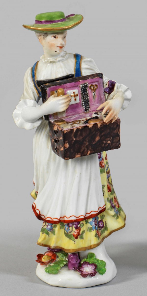 Tirolerin mit Schmuckkasten, sog. "Herzdosenverkäuferin" Auf einem mit plastischen Blüten und Blättern belegten Sockel stehende junge Dame in grünem Tiroler Hut, weißer Bluse, blaufarbenem Mieder und weißer Schürze über gelbem, von Indianischen Blüten gemustertem Rock, unterschiedliche Näh- und Toilettenutensilien aus einem großen, purpurfarben gefütterten Kasten zum Kauf anbietend. Entw. Johann Joachim Kaendler, überarbeitet von Peter Reinicke. Minim. rest.; H. 16 cm.