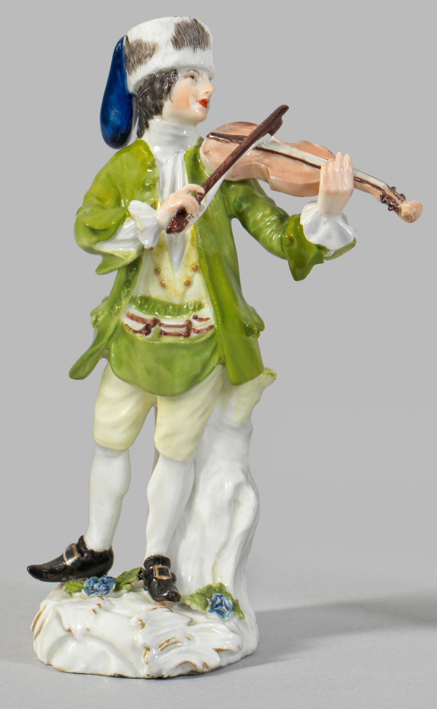 Geigenspieler aus der Serie "Cris de Paris" Auf rocaillereliefiertem Sockel stehender, die Geige spielender Ausrufer mit Husarenmütze und Liederbüchern. Polychrome Malerei mit Goldstaffage. Entw. Johann Joachim Kaendler/Peter Reinicke. Rest.; Schwertermarke. H. 14,5 cm.