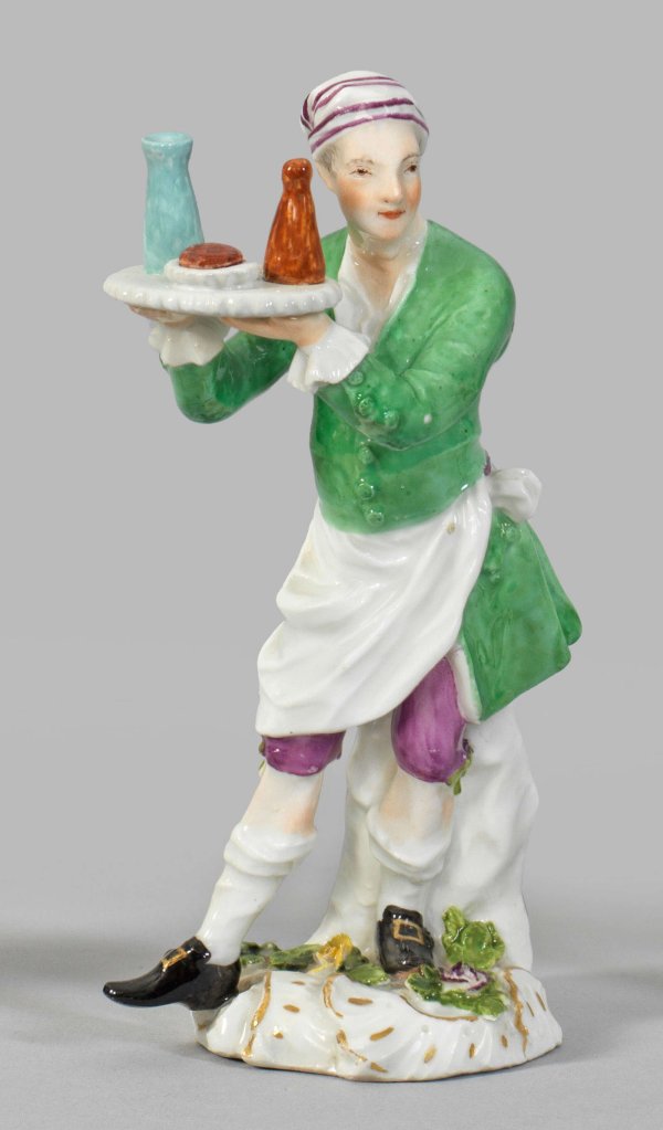 Patissier aus der Serie "Cris de Paris" Auf rocaillereliefiertem, mit plastischen Blüten und Blättern belegtem Sockel stehender junger Herr als Pariser Ausrufer, auf einem Tablett Gebäck und Limonade darbietend. Polychrome Malerei mit Goldkonturierung. Entw. Johann Joachim Kaendler und Peter Reinicke. Minim. rest.; Schwertermarke. 13,5 cm.
