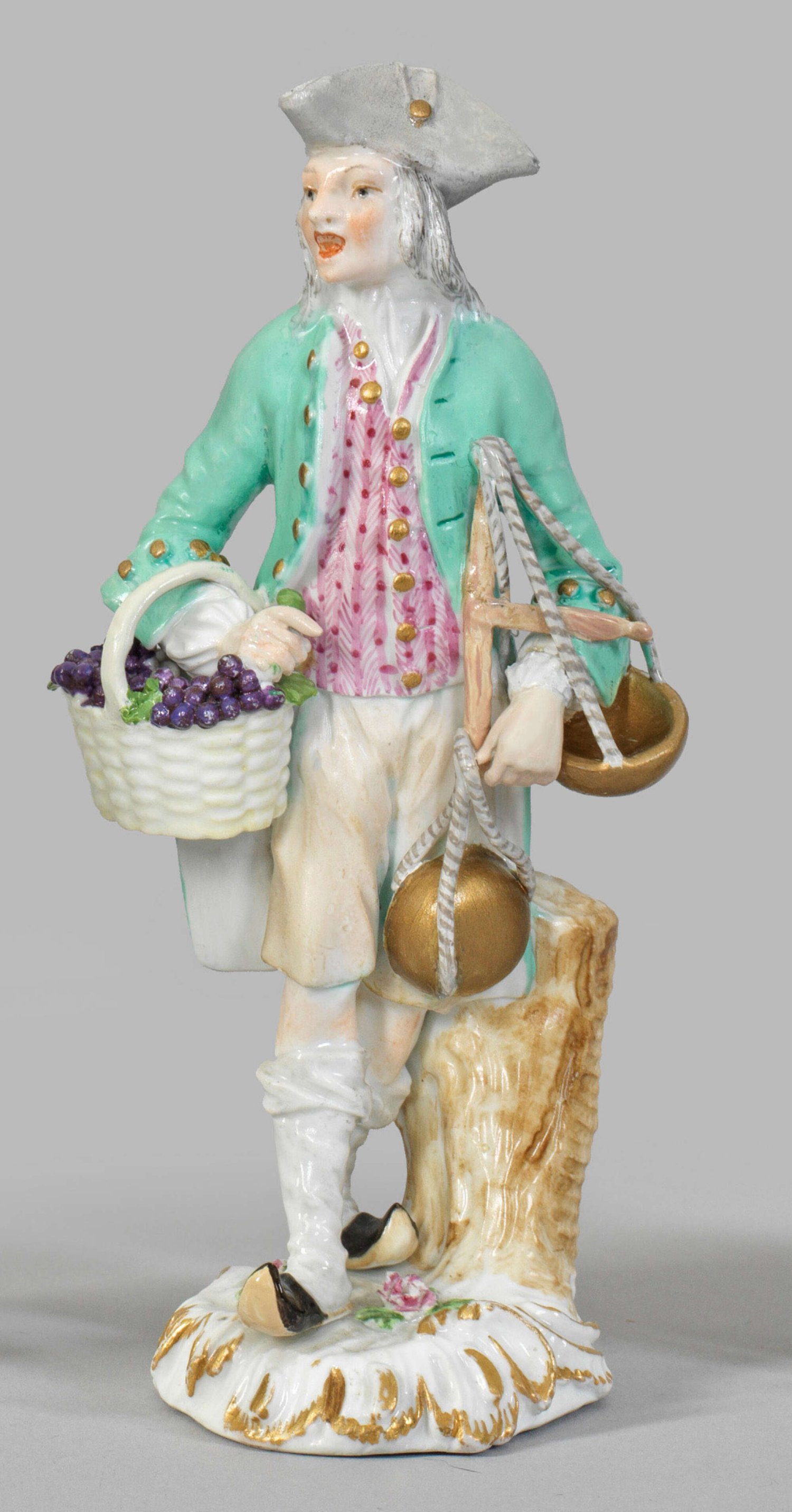 Traubenverkäufer aus der Serie "Cris de Paris" Auf rocaillereliefiertem Sockel stehender Ausrufer, im linken Arm eine Waage haltend, an seinem rechten Arm einen mit blauen Trauben gefüllten Korb tragend. Polychrome Malerei mit Goldstaffage. Entw. Johann Joachim Kaendler/Peter Reinicke. Rest.; Schwertermarke. H. 14,5 cm.