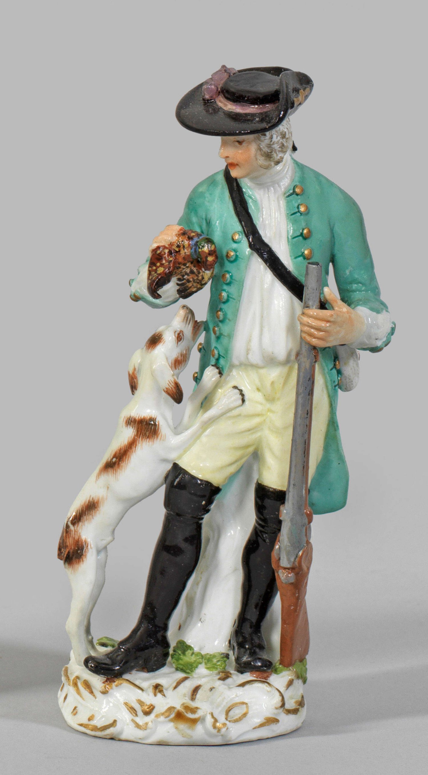 Jäger mit Hund aus der Serie "Cris de Paris" Auf rocaillereliefiertem Sockel stehender Jäger als Pariser Ausrufer in seegrünem Jagdrock über weißem Hemd und gelber Hose, in der rechten Hand das Gewehr, in der Linken das erlegte Tier haltend. Seitlich lehnender Jagdhund. Polychrome Malerei mit Goldstaffage. Entw. Johann Joachim Kaendler. Rest.; Schwertermarke. 14 cm.