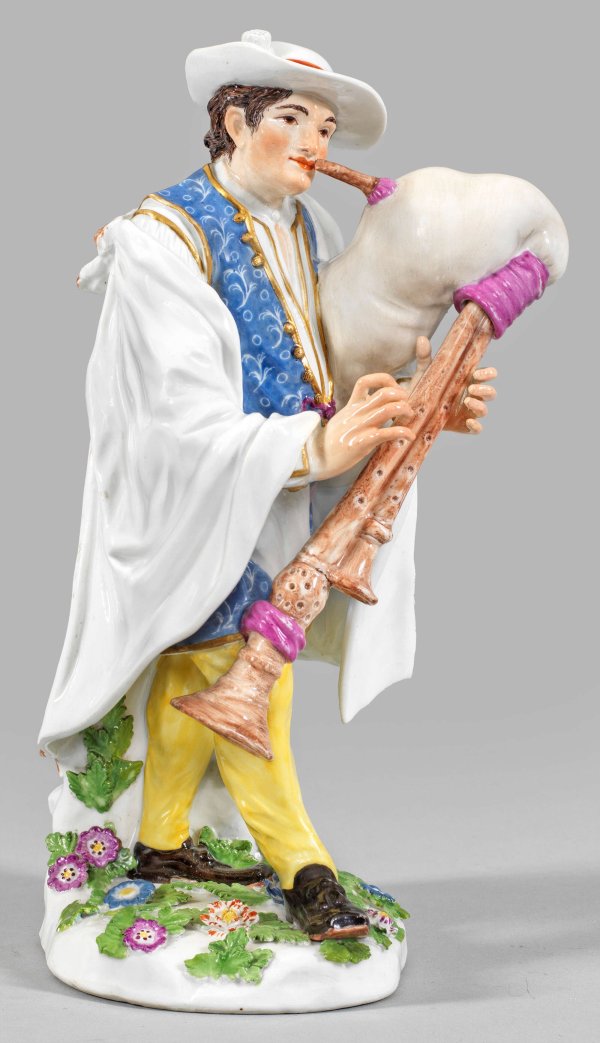 Seltene Figur eines "Savoyardischen Dudelsackspielers" Auf unregelmäßigem, mit plastischen Blüten und Blättern belegtem Sockel stehender, eine große Sackpfeife spielender Musikant aus den Savoyen in weißem Mantel über blauer, blütengemusteter Weste und gelber Hose. Polychrome Malerei mit Goldkonturierung. Entw. Johann Joachim Kaendler/Friedrich Elias Meyer. Unw. rest.; Minim. Brandrisse. Schwertermarke. H. 24 cm.