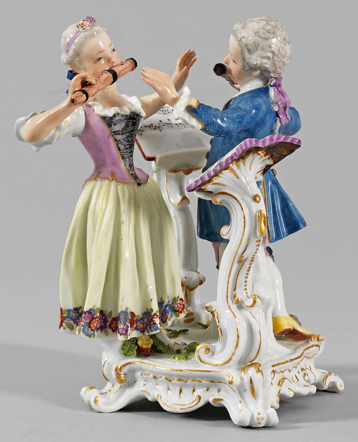 Hauskonzert Quadratischer Sockel mit plastischen Blättern und Blüten auf rocaillenförmigen Füßen. Sommerlich gekleidetes Kinderpaar, ein Mädchen und ein Knabe, eine Querflöte blasend. Jeweils vor ihnen stehendes Pult mit aufgeschlagenem Notenblatt. Polychrome Malerei mit Goldkonturierung. Entw. wohl Johann Joachim Kaendler. Minim. best./rest.; Schwertermarke. H. 17,5 cm.