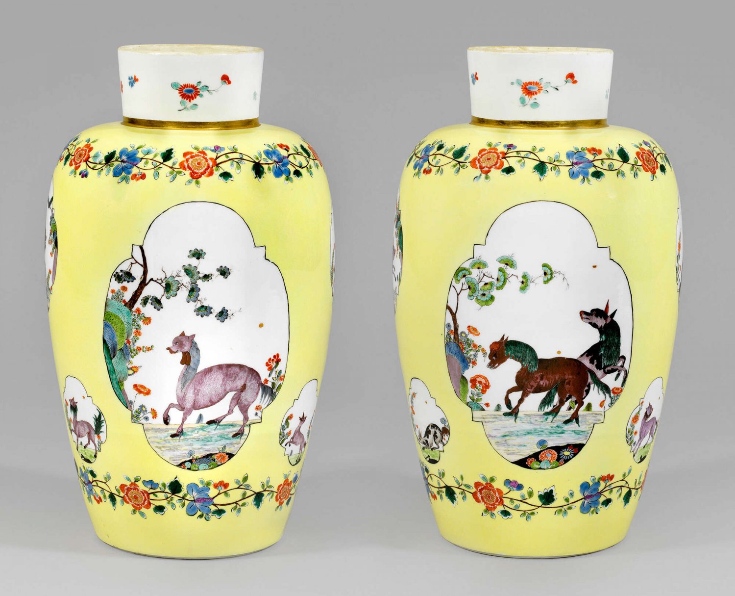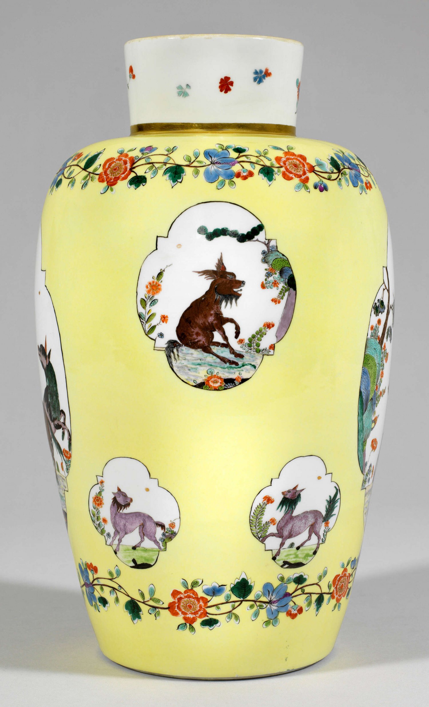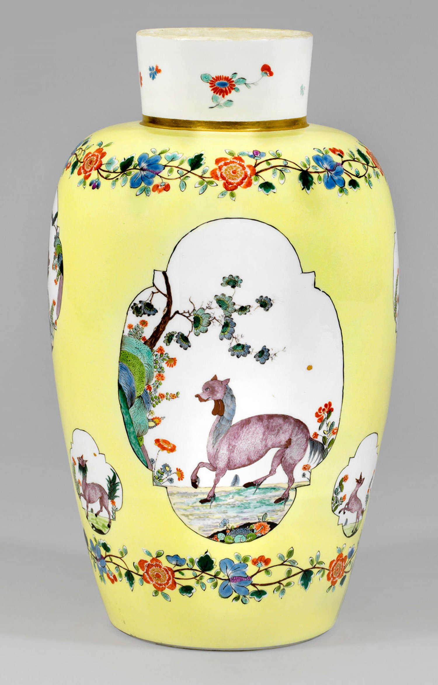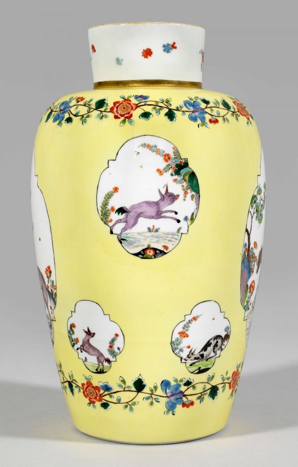 Ovoider Korpus mit gerundeter Schulter und abgesetztem, kurzem, leicht konisch ansteigendem Hals. Auf der Wandung, in hellgelbem Fond ausgesparte, schwarz konturierte Vierpassreserven mit unterschiedlichen, klein- und großformatigen Darstellungen von unterschiedlichen Fabeltieren in stilisierter Gartenlandschaft. Ober- und unterhalb umlaufende Bordüre aus blühenden Indianischen Blumen. Hals mit vereinzelten Streublumen. Farbenprächtige, polychrome, teilw. Gold gehöhte Malerei in Emailblau, Seegrün, Moosgrün, Braun, Purpur, Gelb und Schwarz, wohl von Adam Friedrich von Löwenfinck (1714 Meißen - 1754 Hagenau). Hals teilw. rest.; Unterglasurblaue AR-Monogrammmarke. H. 40 cm.