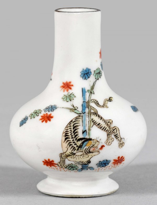 Balusterförmiger Korpus, in schmalen Hals übergehend. Schauseitig gelber Löwe (eigentlich gestreifter gelber Tiger), sich um einen blauen Bambusstab windend. Rückseitig blühende Prunuszweige in polychromer Malerei. Auf dem Boden bez. K.H.C. in Purpur. Rest.; Schwertermarke. H. 6 cm.