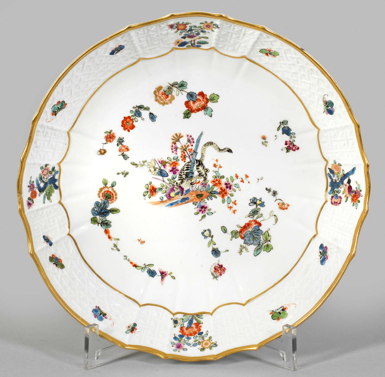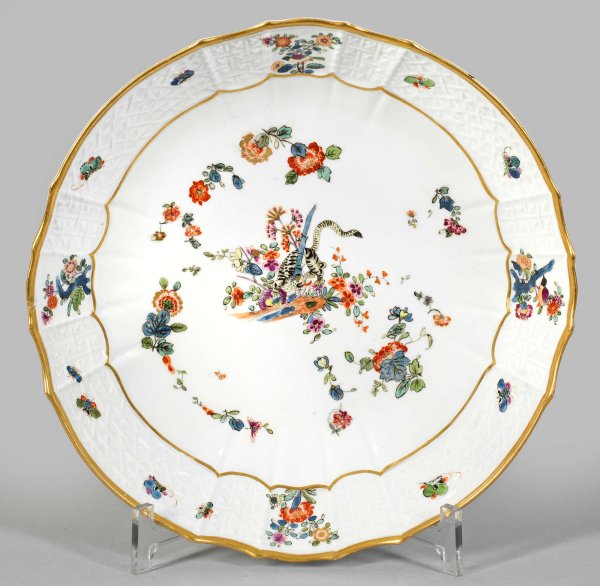 Zierschale mit Dekor "Gelber Löwe" Runde, tief gemuldete Form. Breite, fassonierte Randzone mit Reliefdekor "Alt-Brandenstein" im Wechsel mit Vogelmotiven und Prunuszweigen. Im Spiegel feiner Kakiemondekor nach japanischem Vorbild mit gelbem Löwen (bzw. gestreifter Tiger), sich um einen blauen Bambusstab windend. Umgeben von Indianischen Blütenzweigen. Polychrome, teilw. Gold gehöhte Malerei mit Goldkonturierung. Minim. best.; Schwertermarke. H. 5,5 cm D. 25 cm.