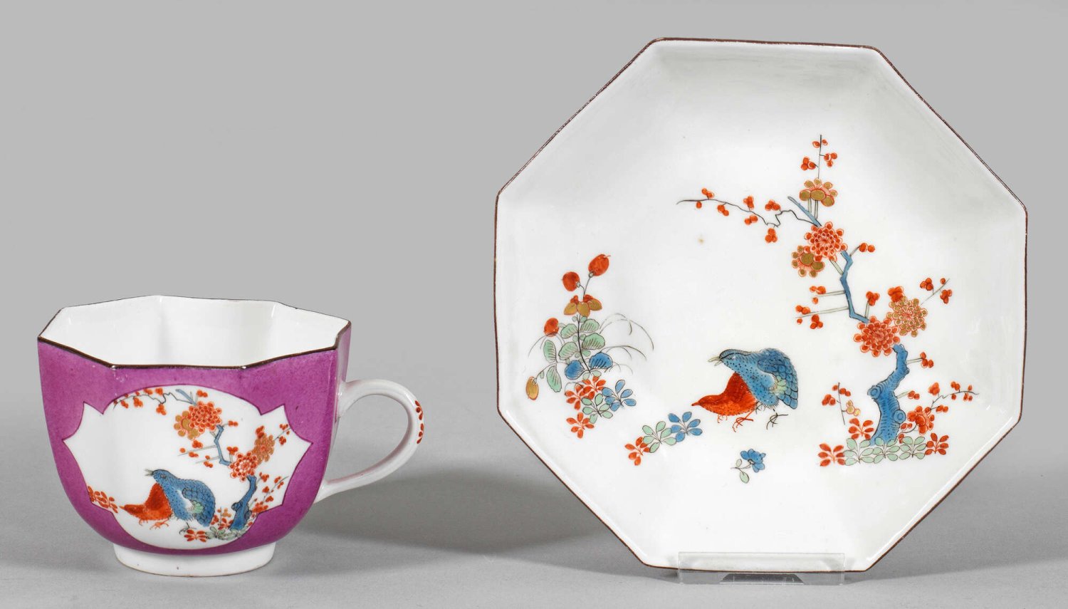 Ziertasse mit Untertasse. Achteckig facettierter, becherförmiger Korpus mit Ohrenhenkel, kapuzinerbraun konturierter Rand. Purpurfarbener Fond. Beidseitig der Wandung vierpassig ausgesparte Reserven mit sog. Wachteldekor. Schauseitig blaue und rote Wachtel, unweit eines blühenden Prunusbaumes stehend, rückseitig blühende, japanische Kikyô-Pflanze (Ballonblume). Korrespondierender Dekor im Spiegel. Polychrome, teilw. Gold gehöhte Malerei im Kakiemonstil. Schwertermarke. H. 6 cm. D. 7,5 cm – 13 cm.
