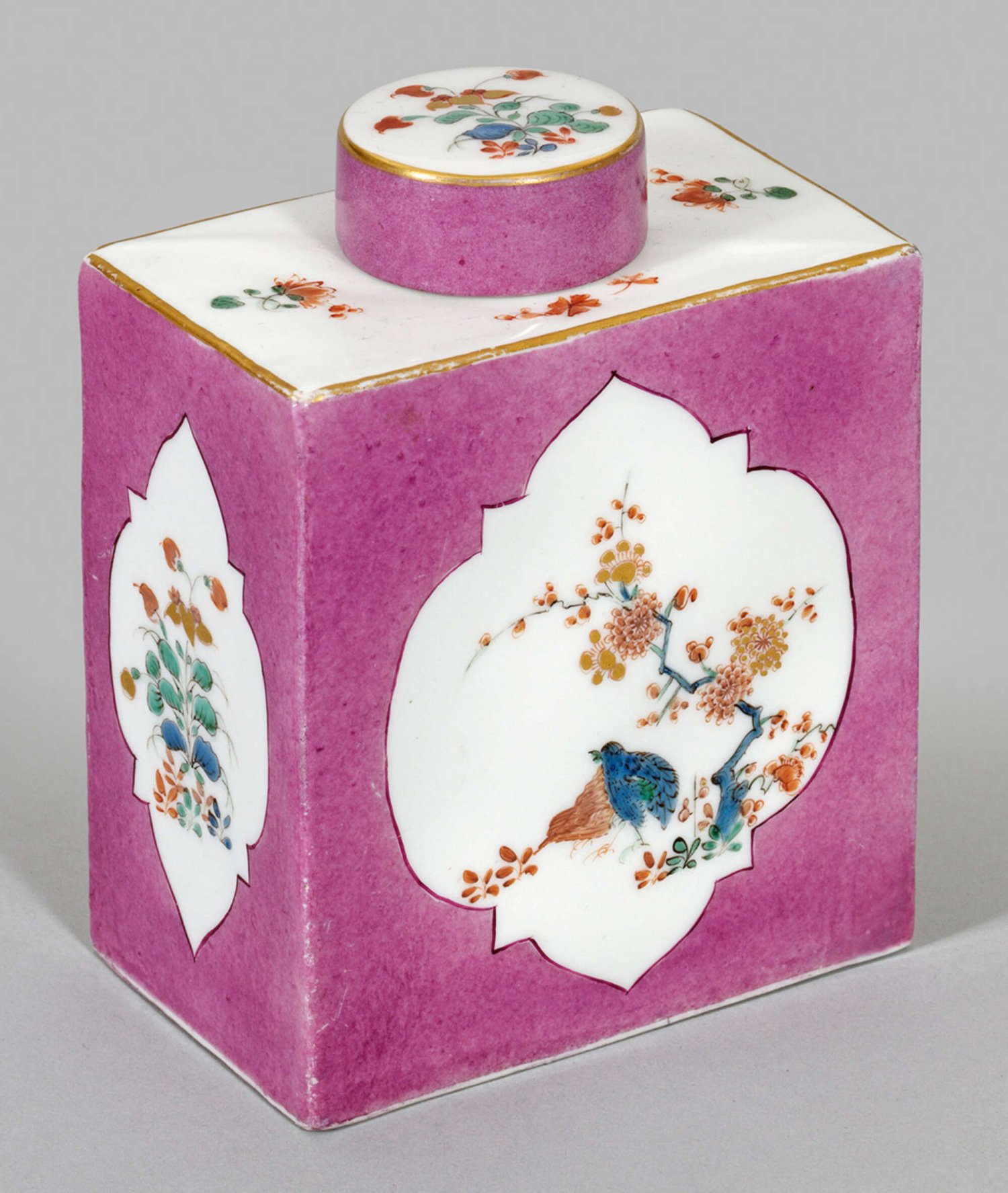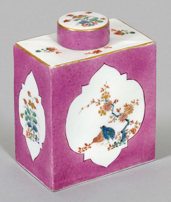 Teedose mit Wachteldekor im Kakiemonstil Hochrechteckige Form mit flacher Schulter und kurzem Hals. Übergreifender, zylindrischer Deckel. Auf der Wandung, in purpurfarbenem Fond, vierpassig ausgesparte Reserven mit sog. Wachteldekor aus blauem und eisenrotem Vogel mit angrenzendem, blühendem Prunusbaum. Schmalseiten, Schulter und Deckel mit Blumengebinden bzw. vereinzelten, gestreuten Blumen. Polychrome Malerei in Emailblau, Seegrün, Eisenrot, teilw. Gold gehöht. Goldrand. Formerzeichen Caspar Meißner Senior. Schwertermarke. H. 11 cm.