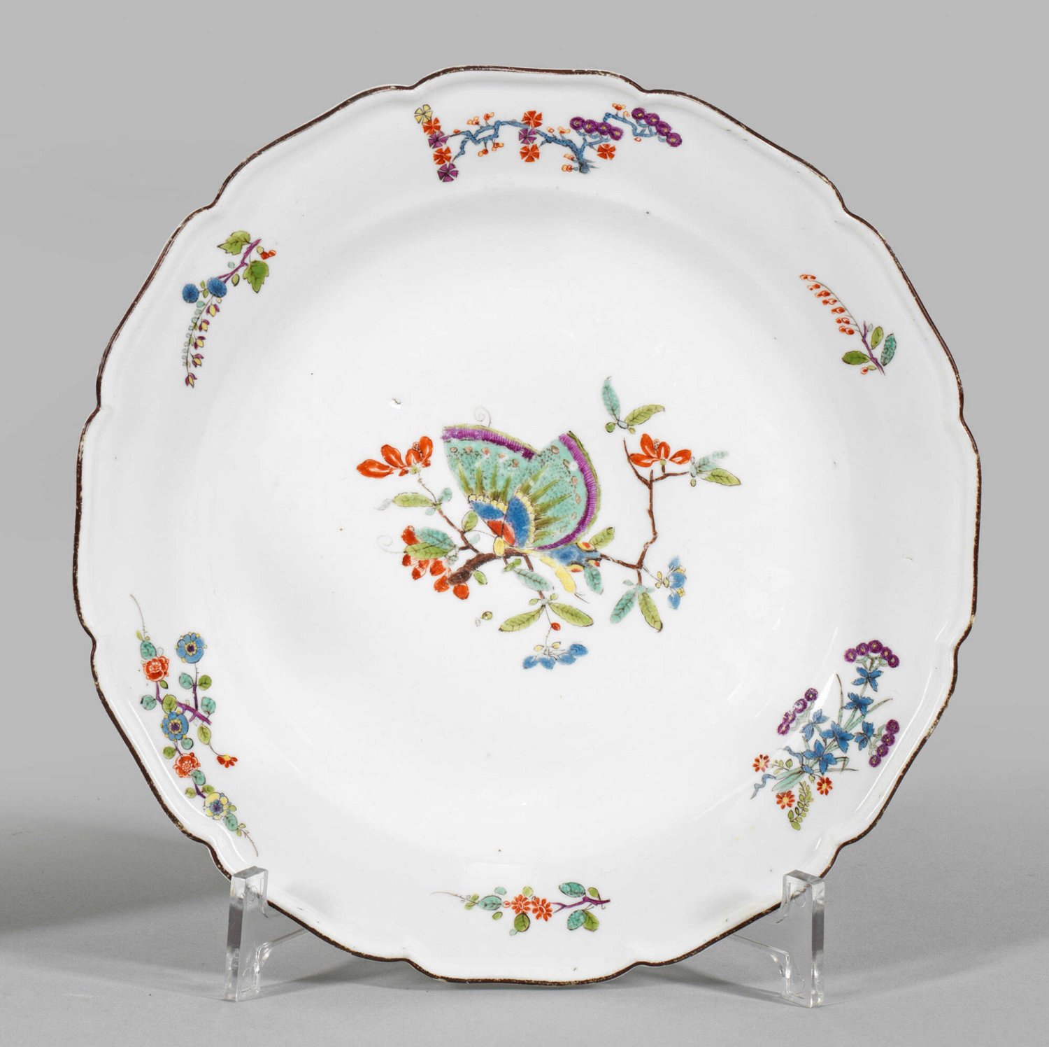 Zierteller mit Schmetterlingsdekor Runde Form mit passigem, braun konturiertem Rand. Im leicht vertieften Spiegel zentrales Motiv eines Schmetterlings mit ausgebreiteten Flügeln, auf der Fahne verschiedene Indianische Blütenzweige. Polychrome Malerei im Kakiemonstil. Minim. ber.; Schwertermarke. D. 22 cm.