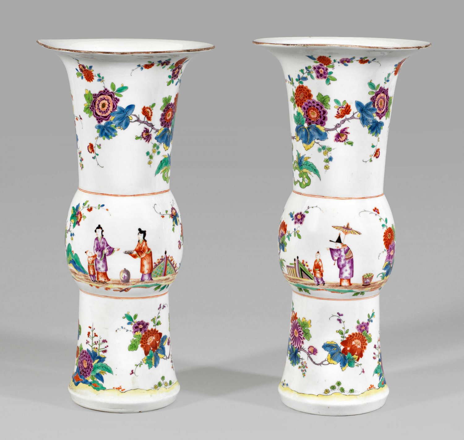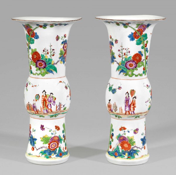 Flötenförmiger, mittig gebauchter Korpus mit trichterartigem Hals und weit ausschwingendem, braun konturiertem Lippenrand. Umlaufend auf der Wandung sog. Chinoiserien und Indianischer Blumendekor. Der gewölbte mittlere Teil der Gefäßwandung mit farbigen, von eisenroter Doppellinie gerahmten, szenischen Darstellungen von chinesischen Paaren, teilw. mit Kindern, zwischen blühenden Päonien-, Prunus- und Chrysanthemenbäumen und Umzäunungen in asiatischer Gartenlandschaft. Ober- und unterhalb begrenzt von langgezogenen, hinter stilisierten Felsformationen emporwachsende Blütenzweige mit großen, blühenden Chrysanthemen und Päonien. Polychrome, teilw. Gold gehöhte Malerei in Eisenrot, Purpur, See- und Moosgrün, Blau, Gelb mit wenig Braun und Schwarz, wohl von Johann Christoph Horn. H. 50,5 cm – 51 cm.