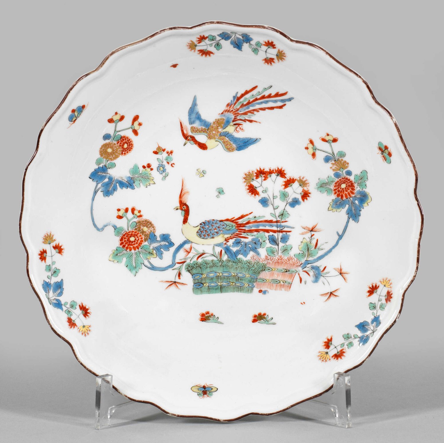 Zierschale mit Kakiemondekor Runde, tief gemuldete Form mit geschweiftem, braun konturiertem Rand. Im Spiegel und auf der ansteigenden Fahne feiner Kakiemondekor. Hinter einer Reisstrohhecke sitzender bzw. fliegender Hôô-Vogel (Phoenix), umgeben von blühenden Chrysanthemen- und Ominaeshi-Blütenzweigen sowie Insekten. Polychrome, Gold gehöhte Malerei. Alte Inv.-Nr. 1268. Schwertermarke. D. 23,5 cm.