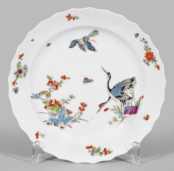 Seltener Zierteller mit Kranichdekor Runde Form mit geschweiftem Rand. Im leicht vertieften Spiegel zwei, an einem Ufer stehende Kraniche, umgeben von Päonienzweigen, einem fliegenden Phönix und Insekten. Auf der Fahne feiner Dekor aus Blütenzweigen und Steublumen. Polychrome Malerei nach chinesischem Vorbild der "famille verte". Minim. rest.; Schwertermarke. D. 21 cm.