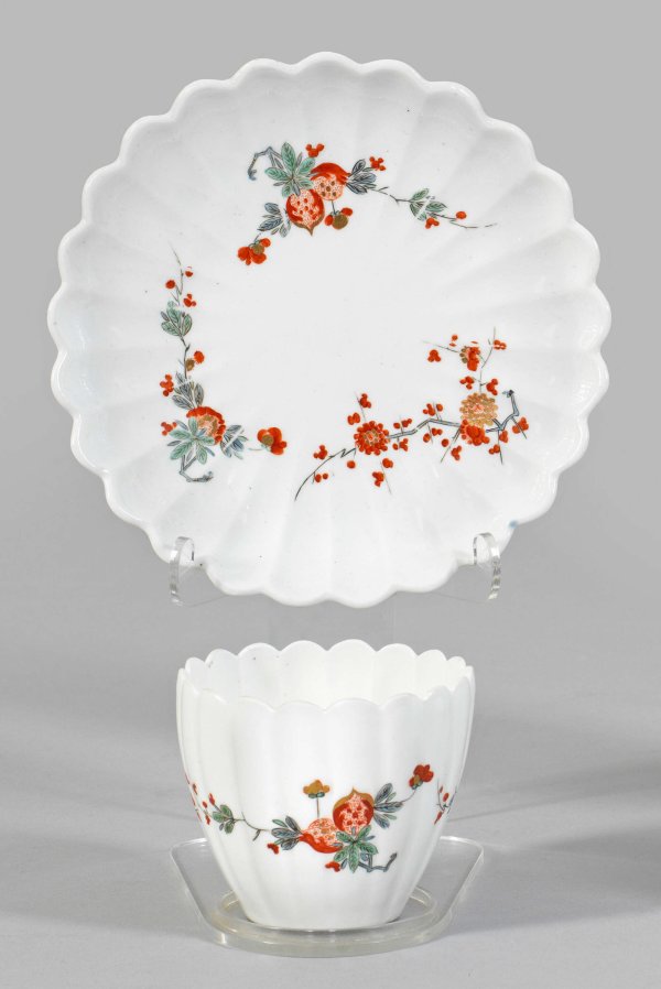 Koppchen mit Kakiemondekor und Unterschale. Konisch ansteigende, fächerartig fassonierte Form. Umlaufend auf der Wandung und im Spiegel feiner Kakiemondekor aus Chrysanthemen- und Päonienzweigen sowie Granatapfelbukett nach ostasiatischem Vorbild. Polychrome, teilw. Gold gehöhte Malerei in Eisenrot, Seegrün und Blau. Minim. ber.; Schwertermarke. H. 6,5 cm.
