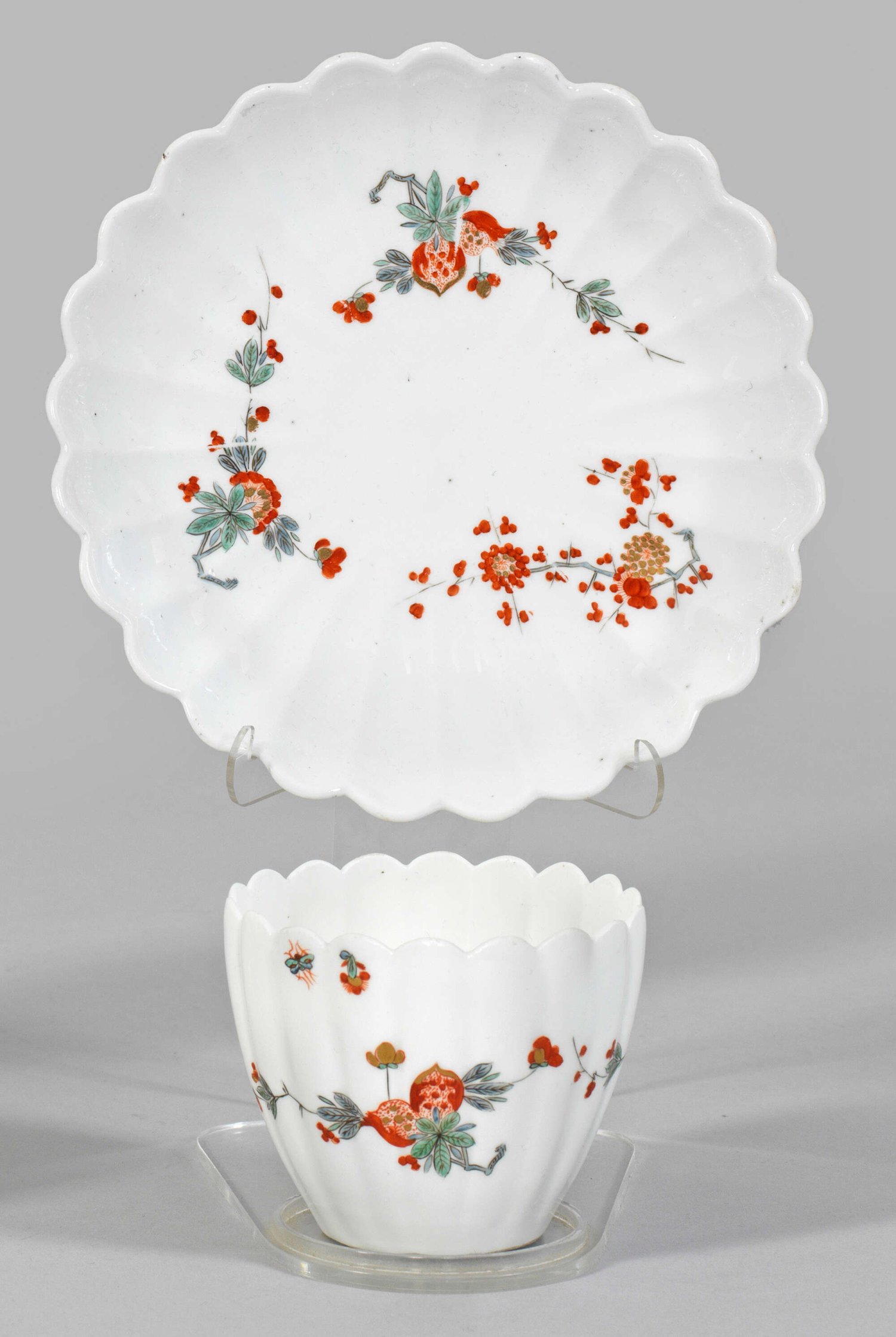 Koppchen mit Kakiemondekor und Unterschale. Konisch ansteigende, fächerartig fassonierte Form. Umlaufend auf der Wandung und im Spiegel feiner Kakiemondekor aus Chrysanthemen- und Päonienzweigen sowie Granatapfelbukett nach ostasiatischem Vorbild. Polychrome, teilw. Gold gehöhte Malerei in Eisenrot, Seegrün und Blau. Schwertermarke. H. 6,5 cm.