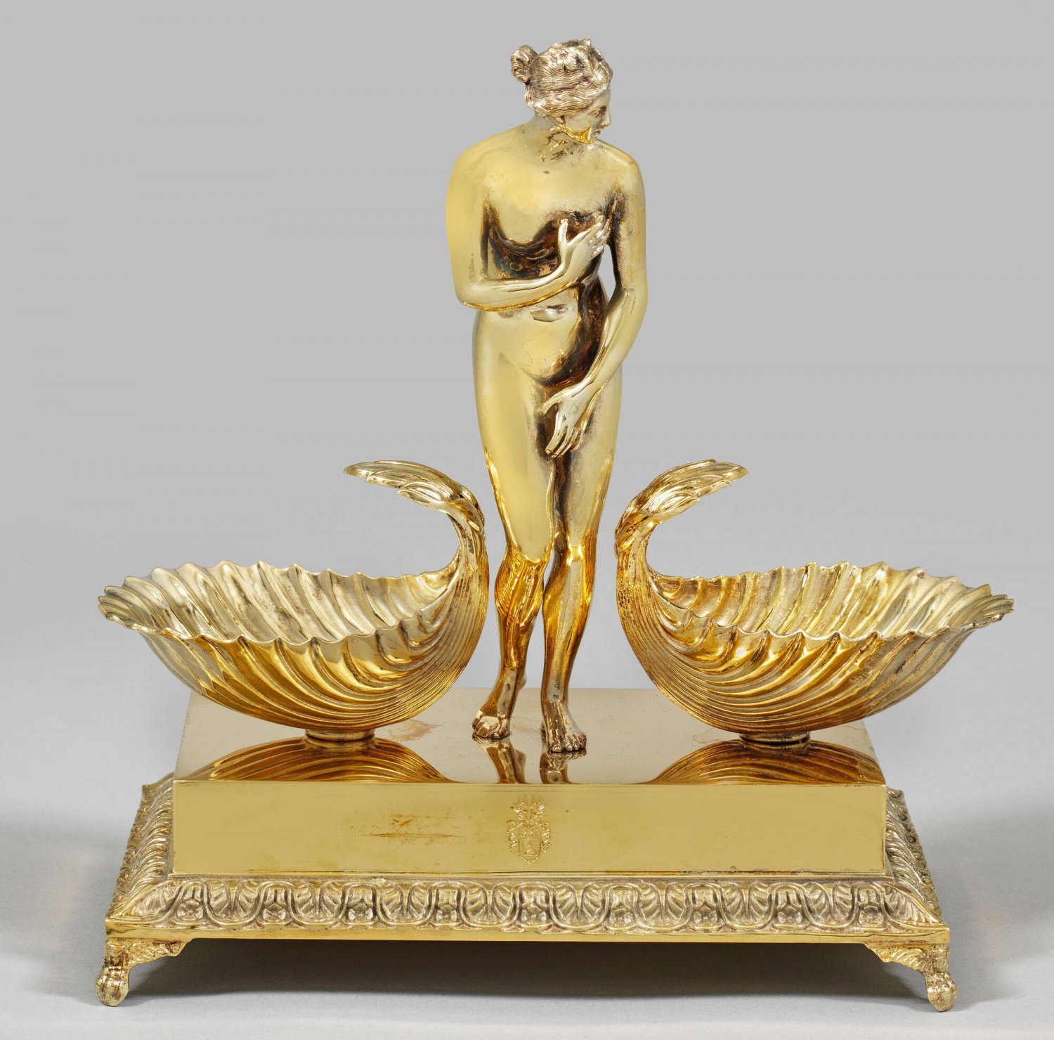 Seltener Wiener Tafelaufsatz Silber, vergoldet. Auf Löwentatzen stehendes Postament mit umlaufendem Palmettenfries. Darüber erhebt sich die vollplastische Darstellung der leicht nach vorn gebeugten, die Hand zur Brust führenden, schamhaften Venus Pudica. Die aus dem Meer Geborene flankieren zwei tiefgemuldete Herzmuschelschalen, die sich nach innen hin wellenartig wölben. An der geraden Wandung graviertes Wappen. Gest. Beschaumarke, Meister Anton Köll (wird Meister 1797). Gew. ca. 1810 g. H. 22 cm. B. 22 cm.