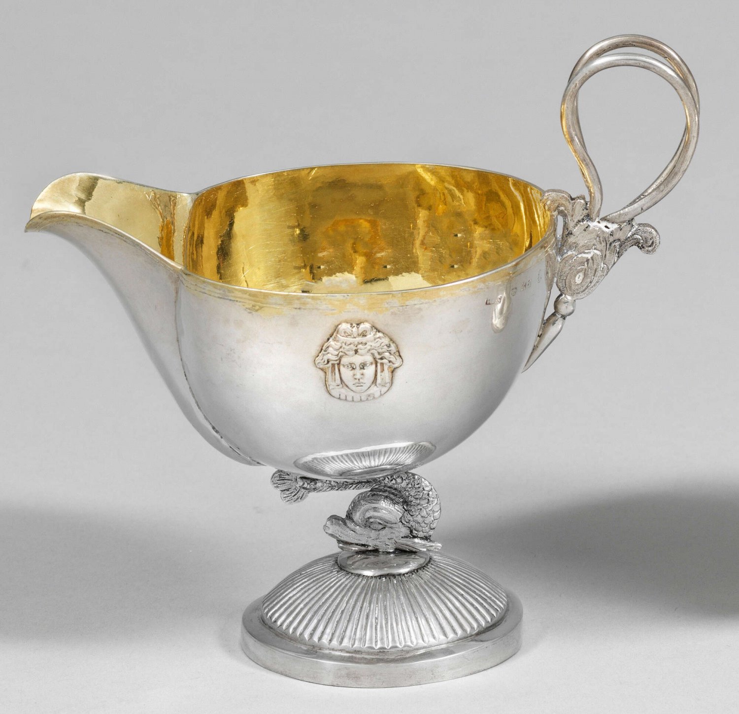 Empire-Sahnegießer Silber. Über gewölbtem, kanneliertem Stand kurzer, abgeflachter Schaft in Gestalt eines Delphins. Halbkugelige Kuppa mit tief angesetztem Ausguss, beidseitig besetzt mit Maskarons. Aus einem Blütenkelch aufsteigender Griff in Form von zwei gebogten Stäben. Innen vergoldet. Gest., Stadtmarke, Beschauzeichen, Jahresmarke H3, Meister Petter Adolf Sjöberg (wird Meister 1798). Gew. ca. 185 g. H. 14 cm.