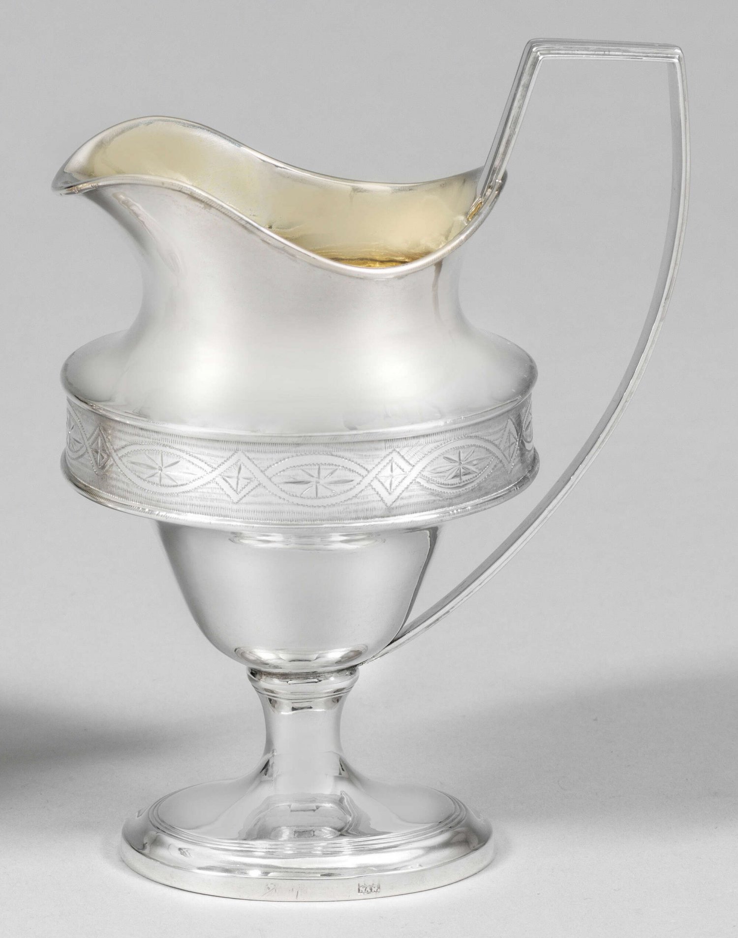 Braunschweiger Empire-Rahmkrug Silber. Über flachem Ovalstand sich glockenförmig erweiternder Korpus mit abgesetzter Schulter und kurzem Ausguss. Wandung akzentuiert durch breiten, gravierten Ornamentfries. Profilierter, gekanteter Bandhenkel. Innen vergoldet. Gest., Stadtmarke, Meister Johann Caspar Hoffmann (wird Meister 1781). Gew. ca. 305 g. H. 17 cm.