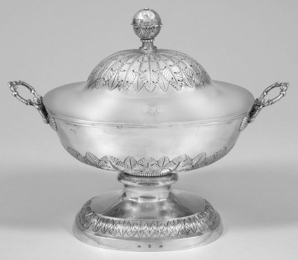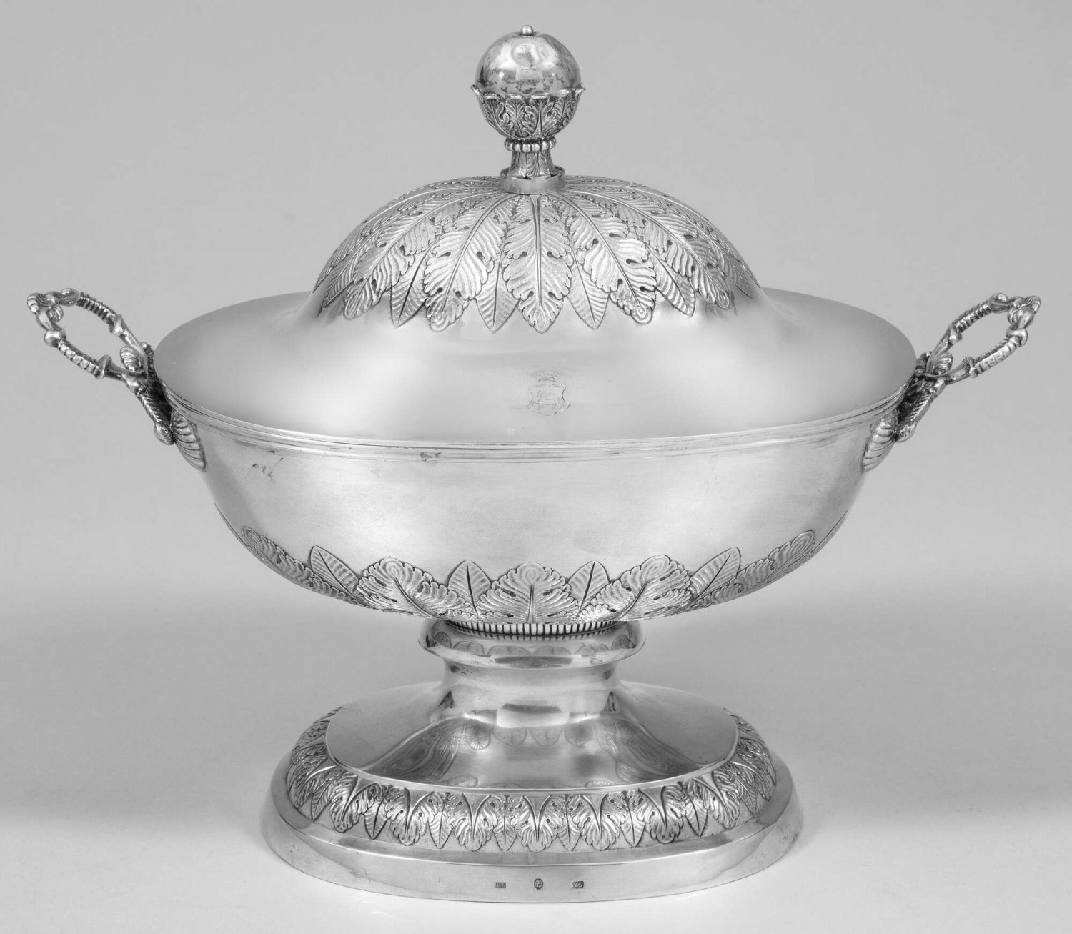 Prächtige Empire-Deckelterrine Silber. Über einem ovalen Stand mit Palmettenfries, in der Verjüngung ein Riefenkranz, übergehend in einen bauchigen, montierten Schalenkorpus mit langgezogenem Palmettenfries. Doppelt profilierter Schalenrand. Seitlich über Herzmuscheln angesetzte Handhaben, muschelförmig reliefiert. Korrespondierender Deckel, innen vergoldet, mit dreireihigem Palmetten- und Blätterfries aus dem ein glatter runder Fruchtknauf erwächst. Unter siebenzackiger Krone Wappenschild mit trabendem Pferd. Prachtvolle, klassizistische Arbeit. Minim. Gebrauchsspuren. Gest. Stadtmarke, Meister Jürgen Joachim Jürgensen (1779-1837). Gew. ca. 3030 g. H. 34 cm.