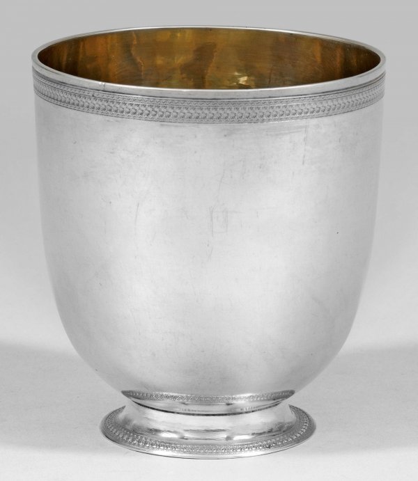 Großer Empire-Fussbecher Silber. Über flachem Stand hoher, zylindrischer Korpus mit glatter Wandung. Stand- und Lippenrand umzogen von sehr fein ornamentierten Blattfriesen. Innen vergoldet. Gest., Tremolierstrich, undeutl. Stadtmarke, Meister Carl Vogel (wird Meister 1797). Gew. ca. 285 g. H. 11,8 cm.