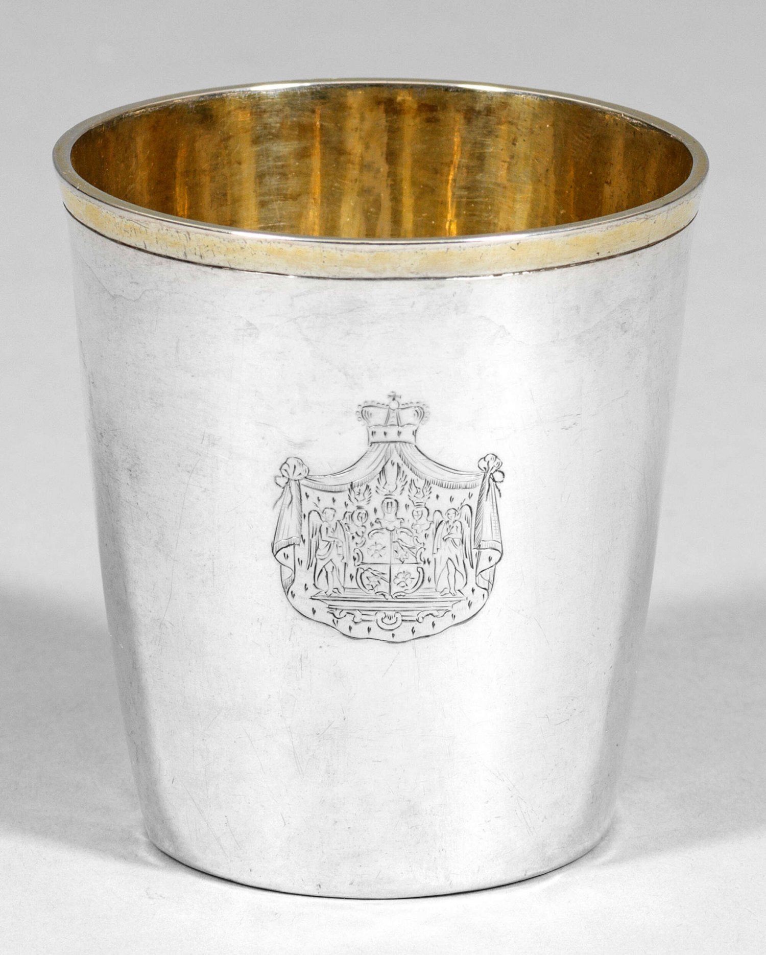 Silber, teilvergoldet. Sich konisch erweiternder, glatter Korpus mit profiliertem Lippenrand. Auf der Wandung graviertes Wappen der Grafen zur Lippe sowie rückseitig Namenszug. Auf der Bodenunterseite monogrammiert "G" sowie dat. 1807. Innen vergoldet. Minim. altersgemäße Gebrauchsspuren. Gest. 12 Lot, Stadtmarke, Jahresbuchstabe T, Meister Johann Christoph Wiedemann (Weidemann) (wird Meister vor 1788). Gew. ca. 105 g. H. 7,5 cm.