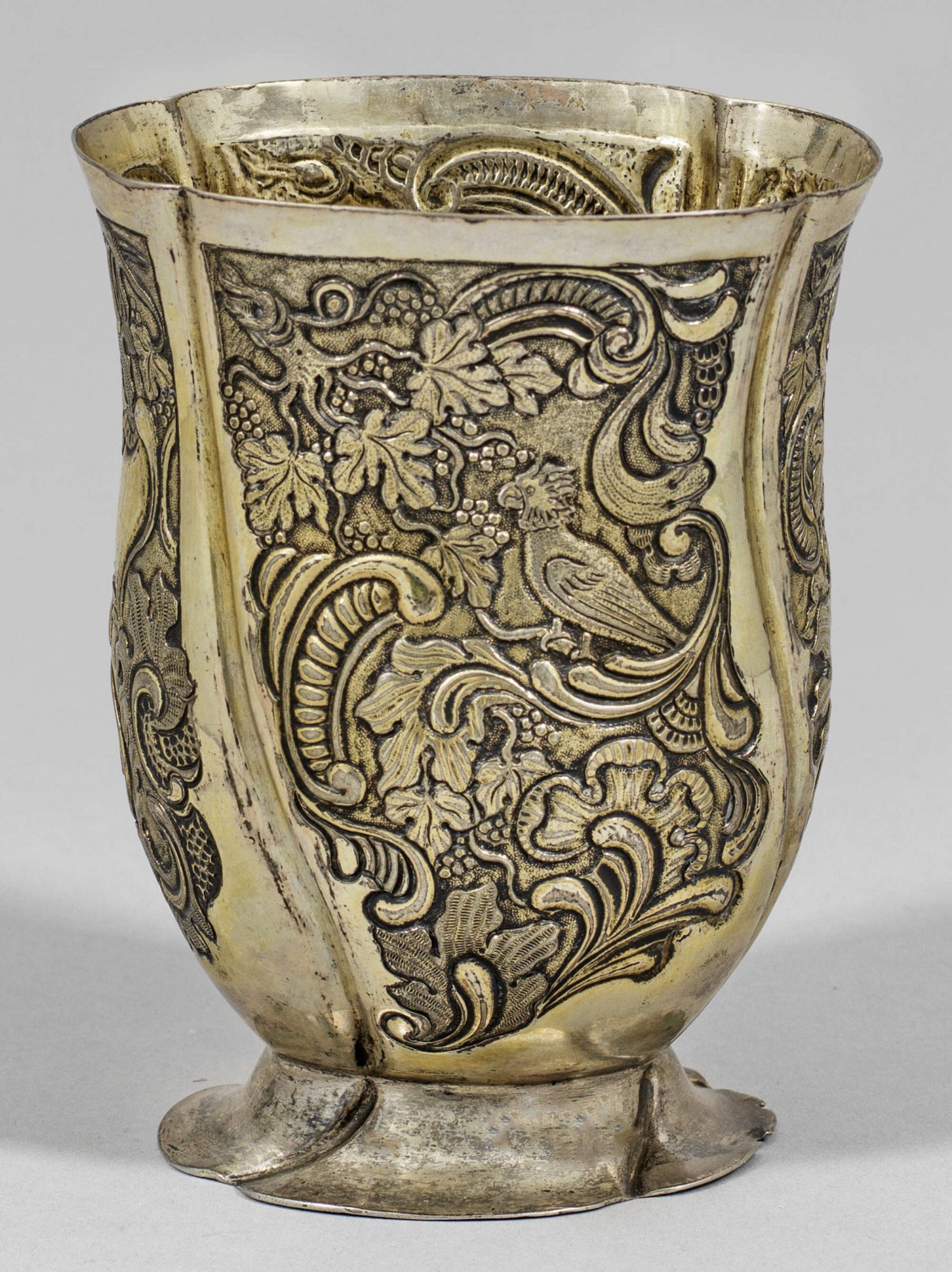 Rokoko-Becher Silber, voll vergoldet. Über passig geschweiftem Stand ovaler, abgeflachter Korpus mit vierpassig geschweiftem Rand. Wandung unterteilt durch vier Kartuschen. Darin unterschiedlicher Reliefdekor aus Rocaillen, Weinlaub und Papageien. Stand minim. besch.; Gew. ca. 130 g. H. 10,4 cm.