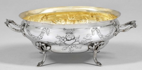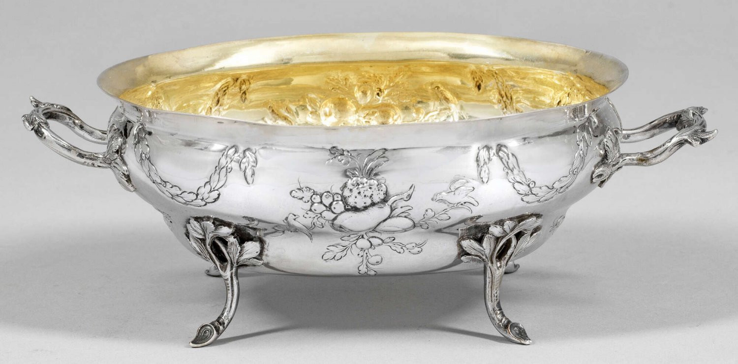 Augsburger Rokoko-Henkelschale Silber. Von astähnlichen Füßen mit reliefplastischem Blattansatz getragener, sich bauchig erweiternder, ovaler Korpus. Glatte Wandung akzentuiert von reliefplastisch getriebenen und fein gravierten Fruchtstillleben an Blattgirlanden. Schmale, astförmige Henkel. Innen vergoldet. Gest., Tremolierstrich, Stadtmarke, Meister Johann Christian Neuss (wird Meister 1766). Gew. ca. 375 g. H. 8,2 cm. 18 cm x 15 cm.