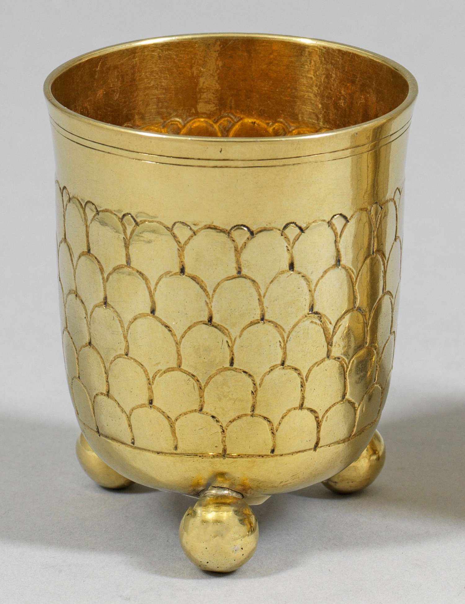 Kleiner Kugelfußbecher Silber, voll vergoldet. Gering konisch ausschwingender Korpus über drei ausgestellten Kugelfüßen. Wandung fünfreihig umzogen von versetzt angeordnetem Schuppendekor. Gest., Tremolierstrich, Stadtmarke, Jahresbuchstabe H, Meister Johann Friedrich Ehe (wird Meister 1773). Gew. ca. 88 g. H. 6,8 cm.