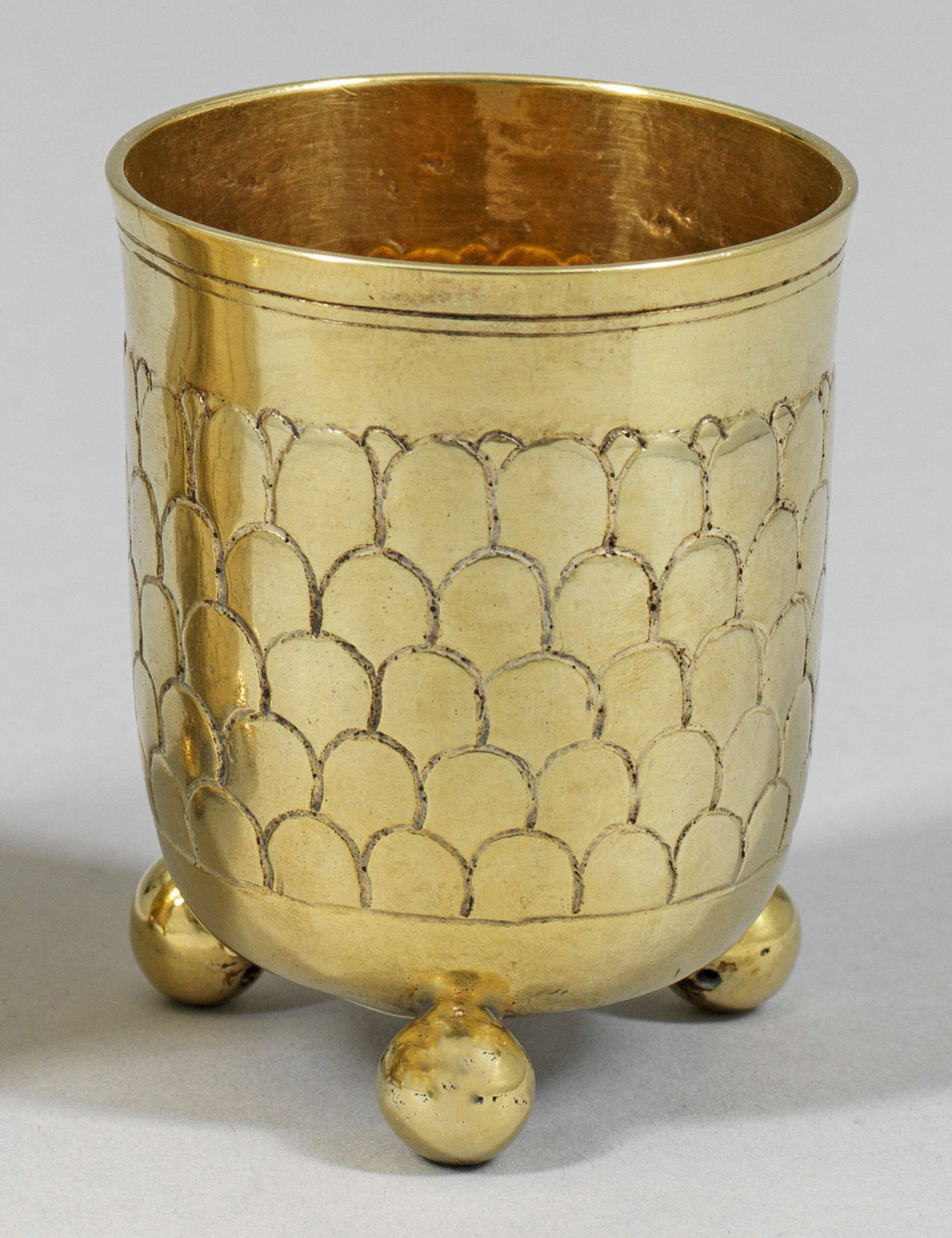 Kleiner Kugelfußbecher Silber, voll vergoldet. Gering konisch ausschwingender Korpus über drei ausgestellten Kugelfüßen. Wandung fünfreihig umzogen von versetzt angeordnetem Schuppendekor. Gest., Tremolierstrich, Stadtmarke, Jahresbuchstabe H, Meister Johann Friedrich Ehe (wird Meister 1773). Gew. ca. 84 g. H. 6,9 cm.