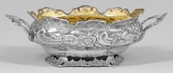 Seltener kleiner Rokoko-Gläserkühler Silber. Über passigem, flachem Stand in Form von Rocaillen ovaler, gedrückt bauchiger Korpus mit ausgestelltem, geschweiftem Rand. Wandung umzogen von feiner Treib- und Gravurarbeit in Form von Voluten und Blüten. Im Spiegel hochreliefplastisch getriebene Blüte. Flache Rocaillenhenkel. Innen vergoldet. Gest., Stadtmarke, Jahresbuchstabe "K", Meister Gottfried Nöffel (Neffel) (wird Meister um 1763). Gew. ca. 420 g. H. 8 cm. 27,5 cm x 15 cm.