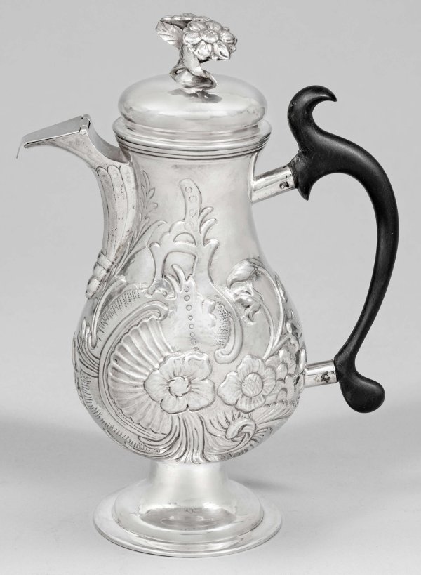 Rokoko-Kaffeekanne Silber. Über flachem Stand birnenförmiger Korpus. Tief angesetzter Schnabelausguss mit scharnierter Abdeckung. Wandung flächendeckend hochreliefplastisch getrieben und graviert in Form von Rocaillen, Blumen und Blattwerk. Gewölbter Deckel bekrönt von Blütenknauf. Korpus durch zylindrische Stege verbunden mit schlankem Volutenhenkel aus ebonisiertem Holz, rest.; Innen vergoldet. Gest., Stadtmarke, undeutl. Meistermarke, wohl Meister Wilhelmus Sittmann (wird Meister 1753). Gew. ca. 650 g. H. 26 cm.