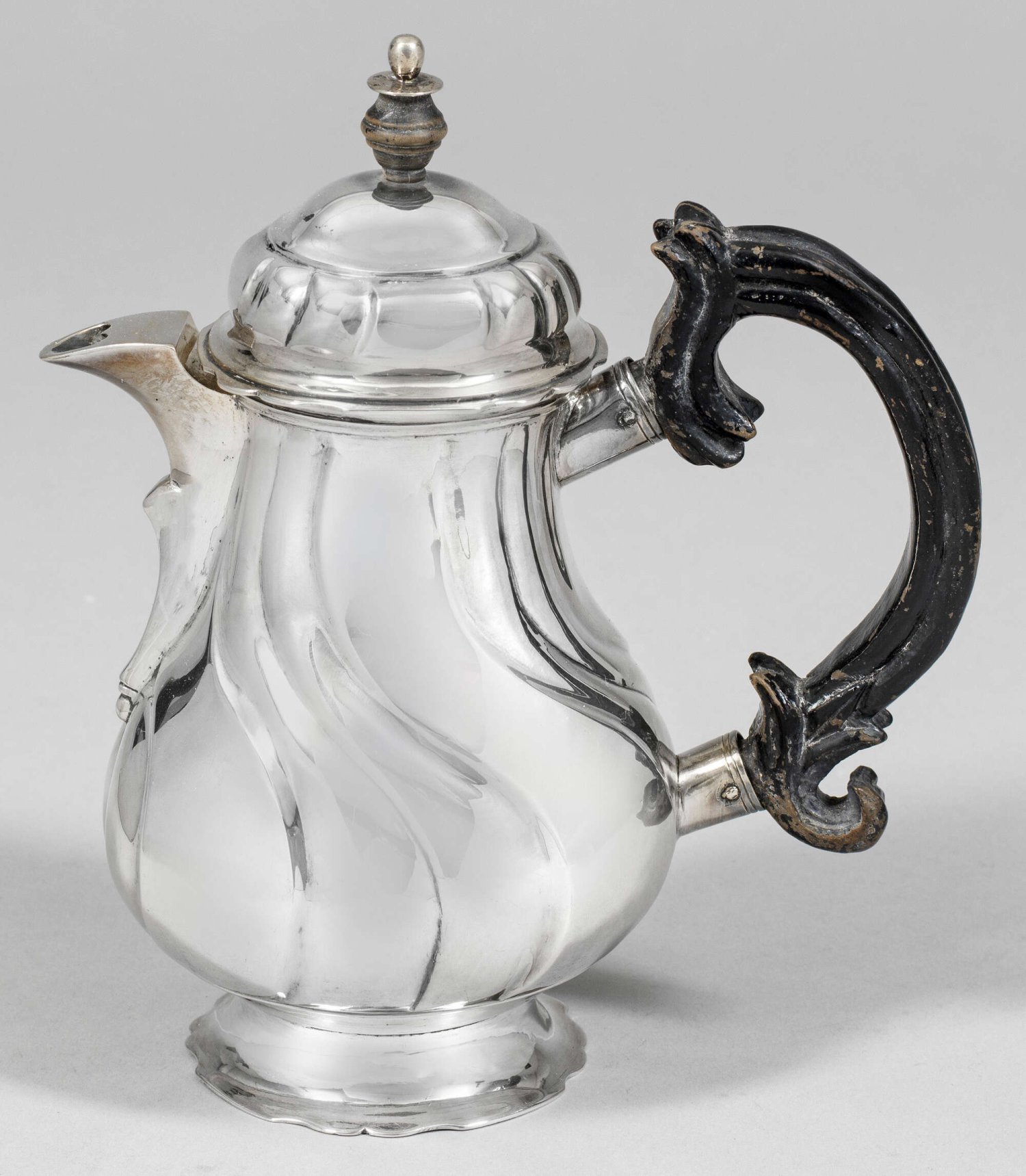 Sehr seltene kleine Rokoko-Schenkkanne Silber. Bauchiger Korpus über konischem Stand mit passig geschweiftem Rand. Wandung und haubenförmiger Deckel gegliedert durch passig geschweifte Züge. Tief angesetzter Konsolausguss. Geschnitzter, ebonisierter Holzgriff. Gest., Stadtmarke, Wardeinzeichen, Jahresbuchstabe Y, Meister Johann Friedrich Horst (wird Meister um 1744). Gew. ca. 330 g. H. 17 cm.