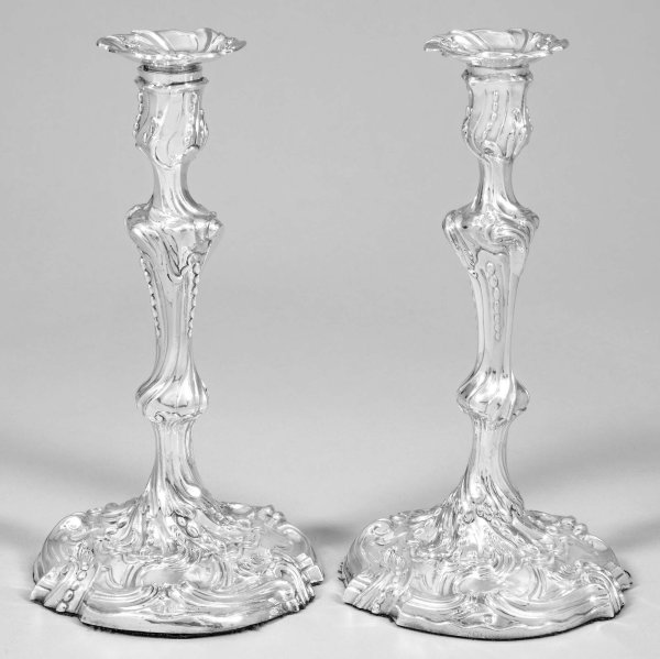 Paar Georgianische Tafelleuchter Silber. Flacher, von reliefplastischen, passigen Voluten gerahmter Stand, beschwert. Mittig aufsteigender, hoher Balusterschaft, übergehend in schlanke, blütenkelchförmige Tülle. Passig geschweifte, herausnehmbare Traufschale. Korpus umlaufend gegliedert durch reliefplastische Voluten, Rocaillen und Perlfriese. Gest., Beschaumarken, Meister William Tuite (tätig um 1755). Beschwert. H. 28 cm.