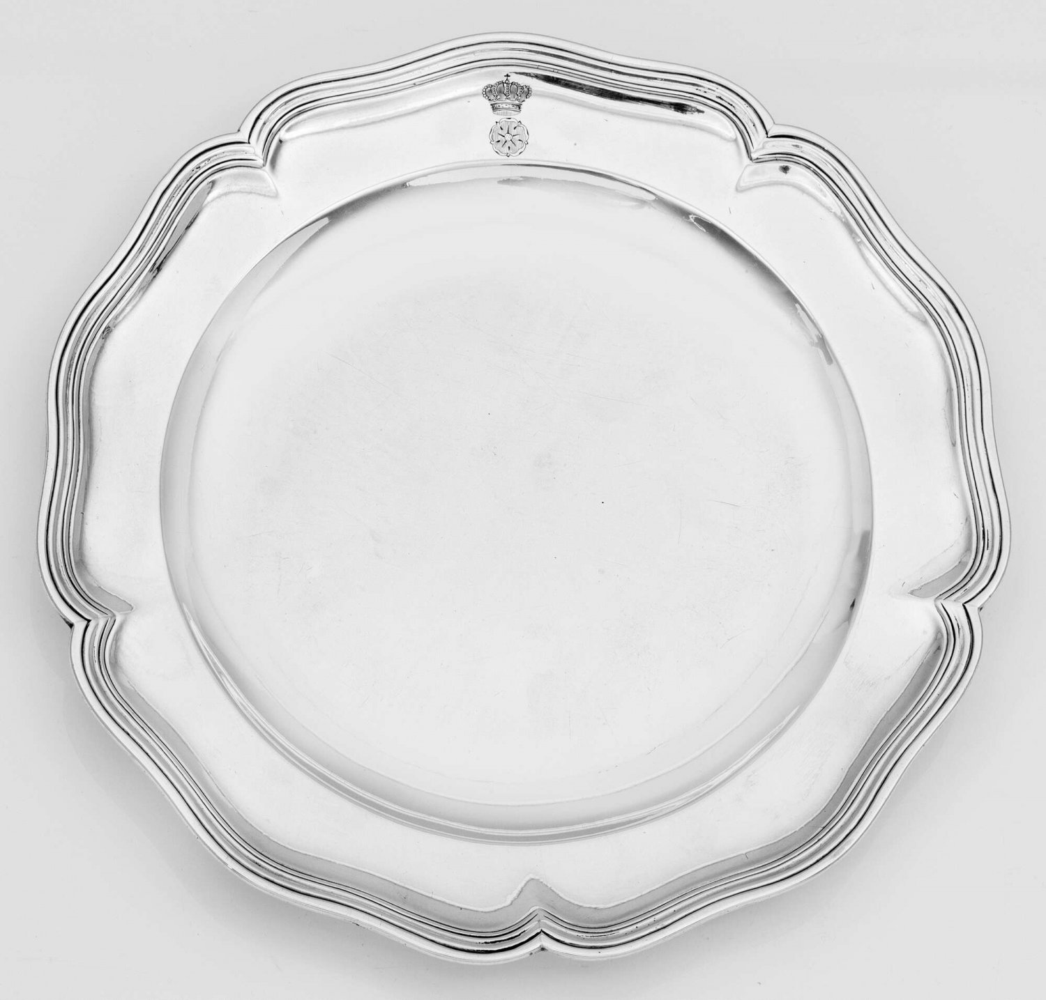 Silber. Gering gemuldeter, glatter Spiegel, übergehend in leicht ansteigende Fahne und blütenförmig geschweiftem, profiliertem Rand. Auf der Fahne fein gravierte Lippische Rose unter Herzogskrone. Gest. 14 Lot, Stadtmarke, Jahresbuchstabe H, Meister Frantz Peter Bunsen (Bürger in der Neustadt seit 1754, Bürger und Hofgoldschmied in der Altstadt seit 1770). Gew. ca. 585 g. D. 25 cm.