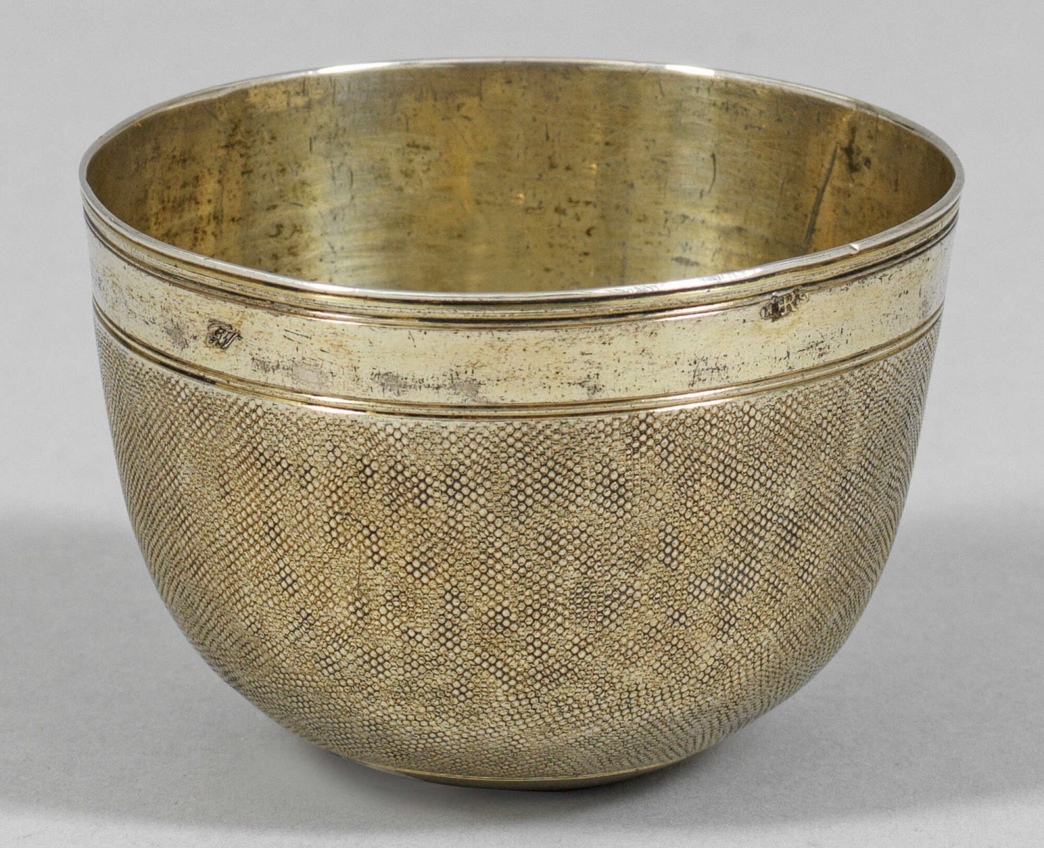 Faustbecher mit Schlangenhautdekor Silber, voll vergoldet. Am Ansatz gerundeter Korpus mit profiliertem, glattem Rand. Wandung flächendeckend punziert im sog. Schlangenhautdekor. Gest., Stadtmarke, Meister Philipp Stenglin (wird Meister 1693). Gew. ca. 85 g. H. 5 cm. D. 7,4 cm.