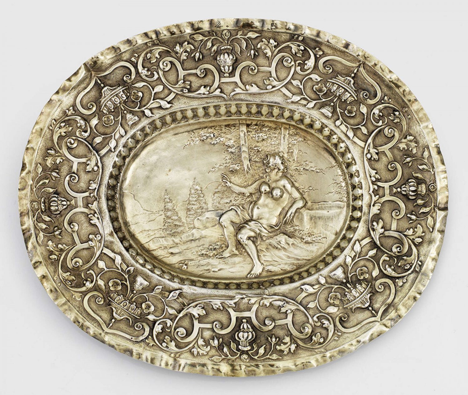 Kleine Augsburger Schauplatte Silber, vergoldet. Im ovalen, vertieften Spiegel szenische, reliefplastisch getriebene Darstellung einer Nymphe in baumbestandener Landschaft, umgeben von Perlfries. Breite, flache Fahne flächendeckend umzogen von Bandelwerkdekor mit gefüllten Vasen. Gekniffener, glatter Rand. Minim. altersgemäße Gebrauchsspuren. Gest., Stadtmarke, Meister Antoni I Grill (wird Meister 1668). Gew. ca. 112 g. 22,2 cm x 19 cm.