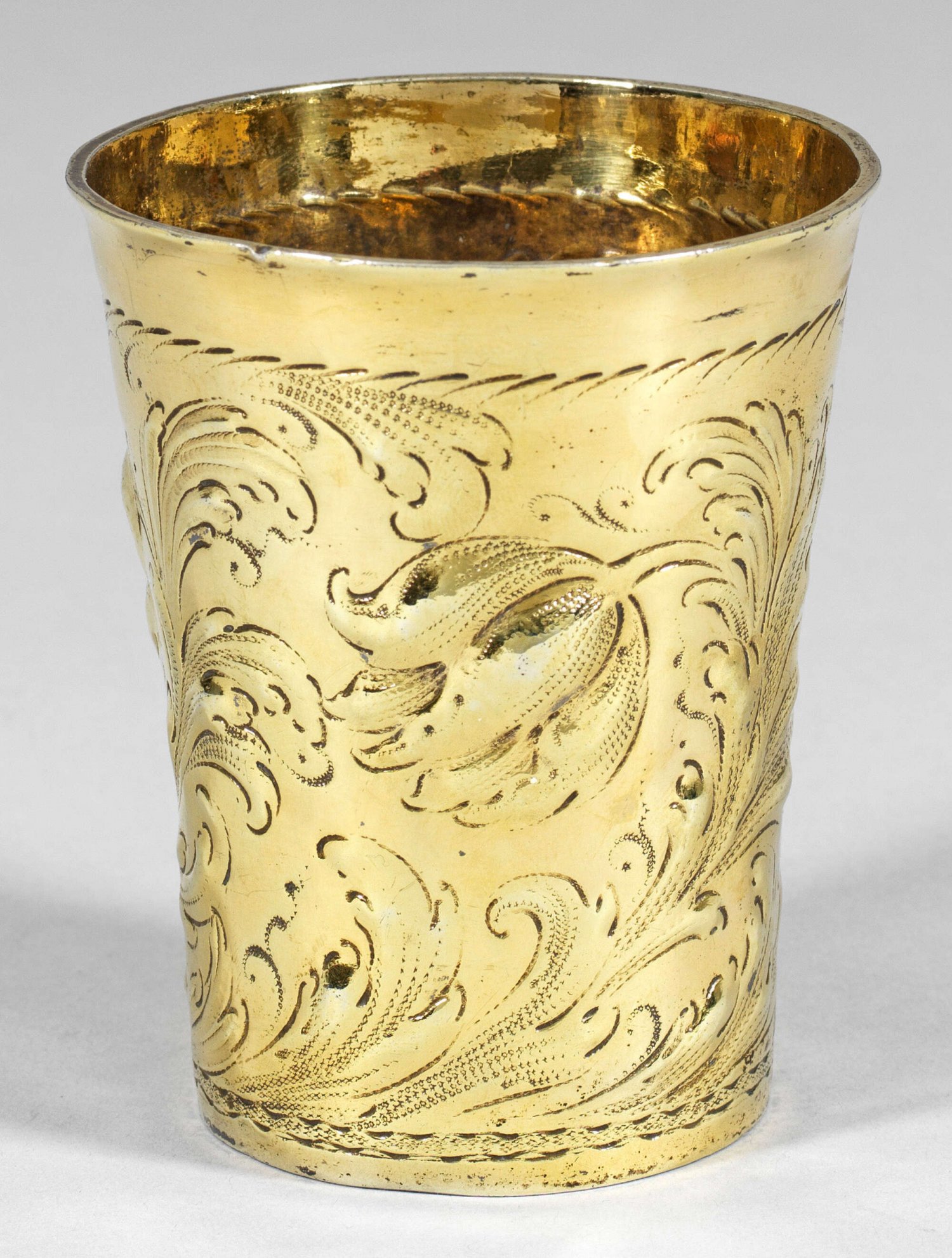 Rigaer Barock-Becher mit floralem Dekor Silber, voll vergoldet. Über kurzem Standring leicht ausschwingender Korpus. Wandungsmitte umzogen von sehr fein getriebenen und gravierten, geschweiften Akanthusblättern und naturalistischen Blüten, ober- und unterhalb begrenzt von schmalen Bändern. Gest., Stadtmarke, Meister Johann Grünberg (wird Meister 1688). Gew. ca. 125 g. H. 10 cm.