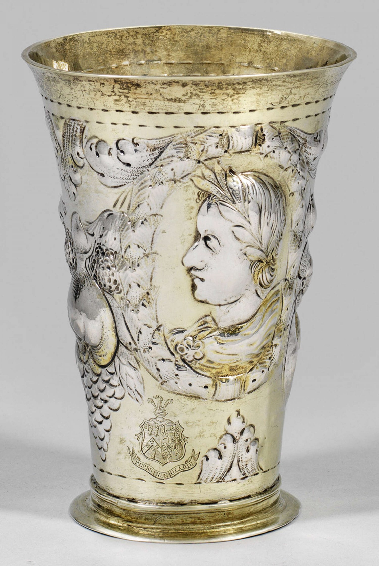 A Gdansk parcel-gilt silver Baroque beaker with two Roman portraits and fruits by Peter Rohde II (master since 1654). Later engraved crest with motto. Gilt inside. City and master´s mark, later St. Petersburg assay and assay master´s marks of 1789.