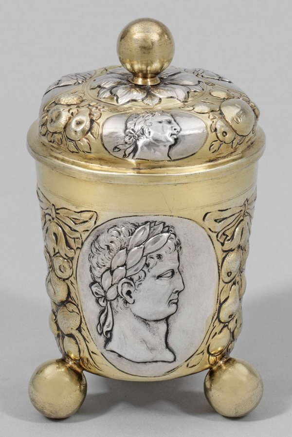 Barocker Kugelfuß-Deckelbecher Silber, teilvergoldet. Über ausgestellten Kugelfüßen zylindrischer Korpus. Wandung und gewölbter Deckel unterteilt durch drei hochovale Felder mit reliefplastisch getriebenen und gravierten Imperatorenköpfen, im Wechsel mit Fruchtgehängen. Kugelknauf. Innen vergoldet. Gest., Tremolierstrich, Stadtmarke, Meister Philipp Müller (wird Meister 1660). Gew. ca. 180 g. H. 15 cm.