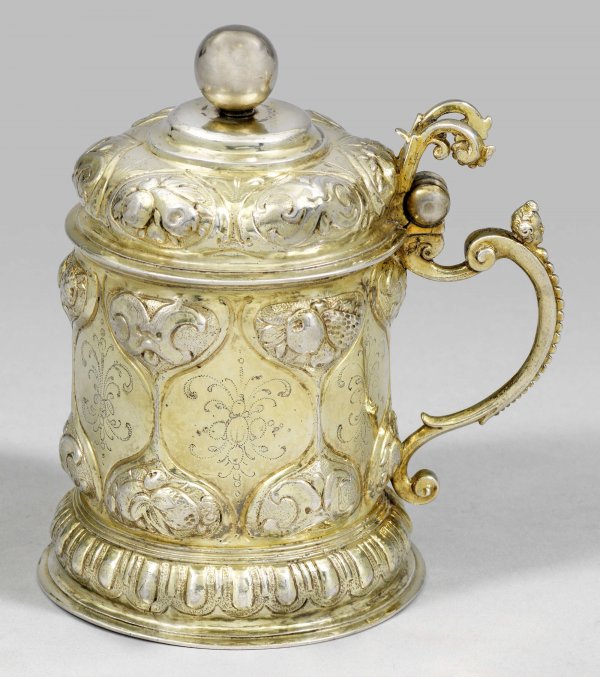 A German gilt silver Baroque chased sixfold tankard with fruits by Leonhard Vorchhamer (master since 1623). Test, city master´s mark, French control marks.