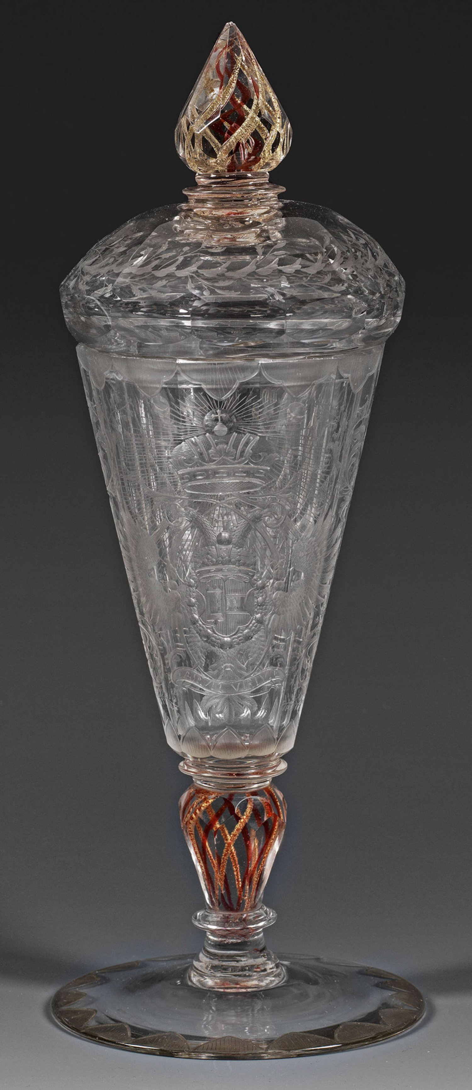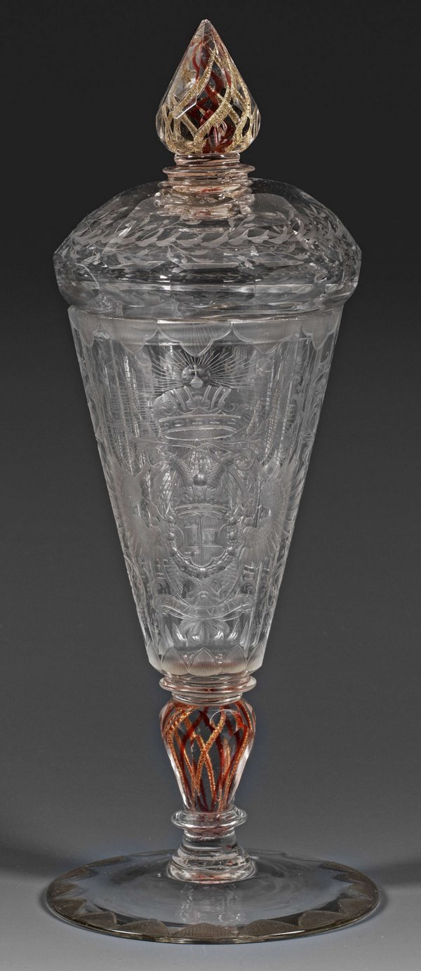 Seltener Deckelpokal mit Habsburger Kaiser-Wappen und Ritter Farbloses Glas mit eingeschmolzenen Rubin- und Goldfäden im Schaft und im Spitzknauf, geschliffen und geschnitten. Flacher Scheibenfuß, Balusterschaft, konische Kuppa, Knauf und Deckelrand facettiert. Auf der Kuppawandung sehr feiner, teilw. geblänkter Schnittdekor. Schauseitig das Wappen der römisch-deutschen Kaiser aus dem Haus Habsburg vor 1740 mit doppelköpfigem Reichsadler, bekröntem Brustschild (mit dem Bindenschild für Österreich und dem Wappen von Kastilien), Kaiserkrone, Collane des Ordens vom goldenen Vlies sowie lateinischem Devisenband "IN VIRTUTE PATRUM" (="In der Tugend der Väter"). Rücks. Darstellung eines stehenden Ritters mit diversen Waffen, auf den Fahnen korrespondierende Inschrift "Segne Gott diese Waffen". Flankierend Akanthusranken, der Lippen- und Fußrand mit schraffierten Bordüren, auf dem Deckel eine umlaufende Blattranke. H. 29 cm.