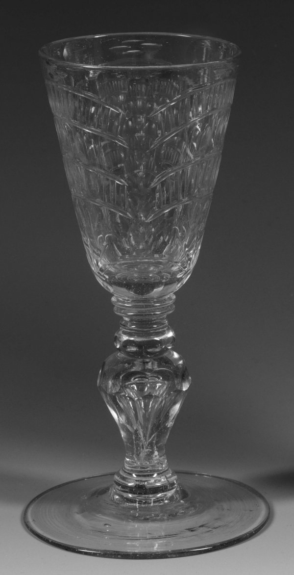 Barock-Pokal Farbloses Glas, geschliffen. Flacher Scheibenfuß, facettierter Balusterschaft mit eingestochener Luftblase, konische Kuppa mit dreifach alternierendem, ornamentalem Dekor aus Bögen und stilisierten floralen Motiven im Keil-, Oliven- und Kugelschliff. H. 18,5 cm.