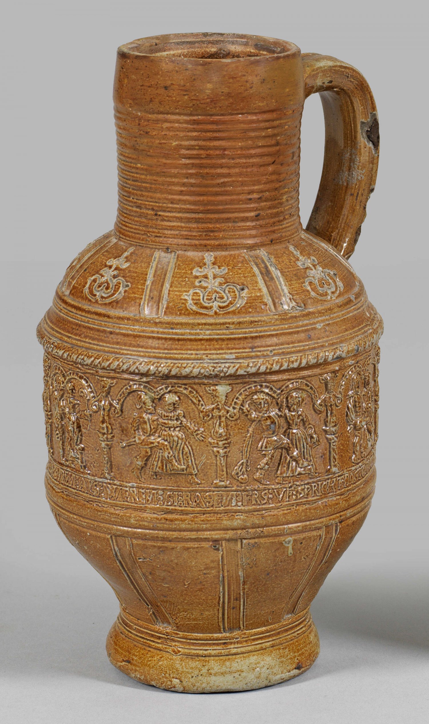Raerener Renaissance-Krug mit Bauerntanz Steinzeug mit hellbrauner Salzglasur. Krug mit walzenförmigem Körper, breitem, zylindrischem Bauchfries, zur abgesetzten Standfläche und zum profilierten Zylinderhals eingezogen. Glatter Ohrenhenkel mit spitz auslaufendem Ansatz. Auf dem Bauchfries eine aufgelegte Bauerntanzszene nach Hans Sebald Beham mit Inschrift "GERHET DU MUS DAPER BLASEN : SO DANSSEN DIE BUREN ALS WEREN SI RASEN : FRS UF SPRICHT BASTOR ICH (...)" mit Dat. "1597." Ger. best.; Lippenrand rest.; H. 21 cm.