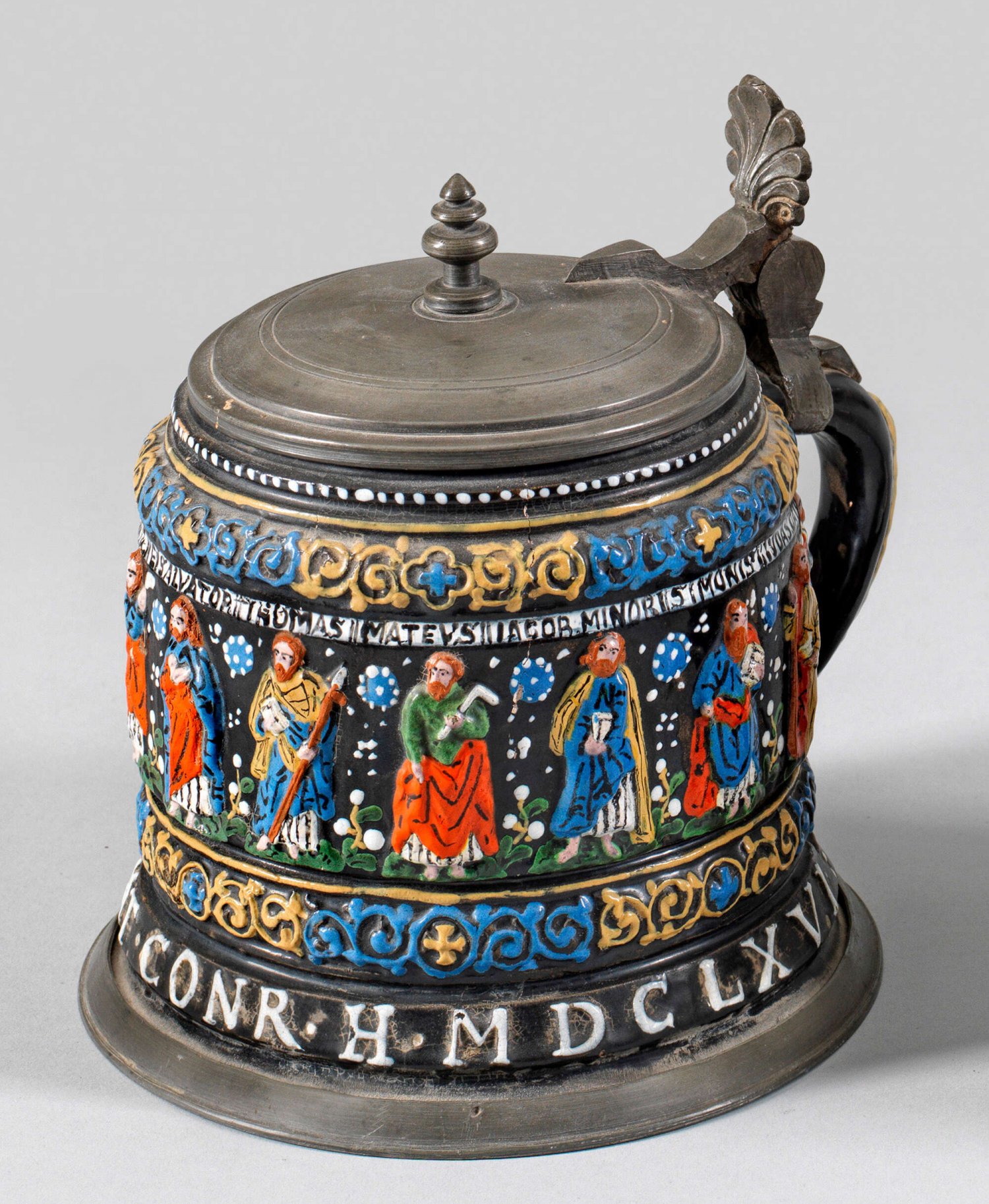 Apostelkrug Dunkelbraun engobierte, glasierte Keramik mit polychromer Emailbemalung. Breiter Relieffries mit namentlich bez. Darstellungen der zwölf Apostel. Unterhalb Inschrift mit römischer Dat. (1661): "ERHARD BRECHT CONR. H. MDCLXVI". Zinnmontierung, der Deckel mit Palmettendrücker. Besch.; H. 17,5 cm.
