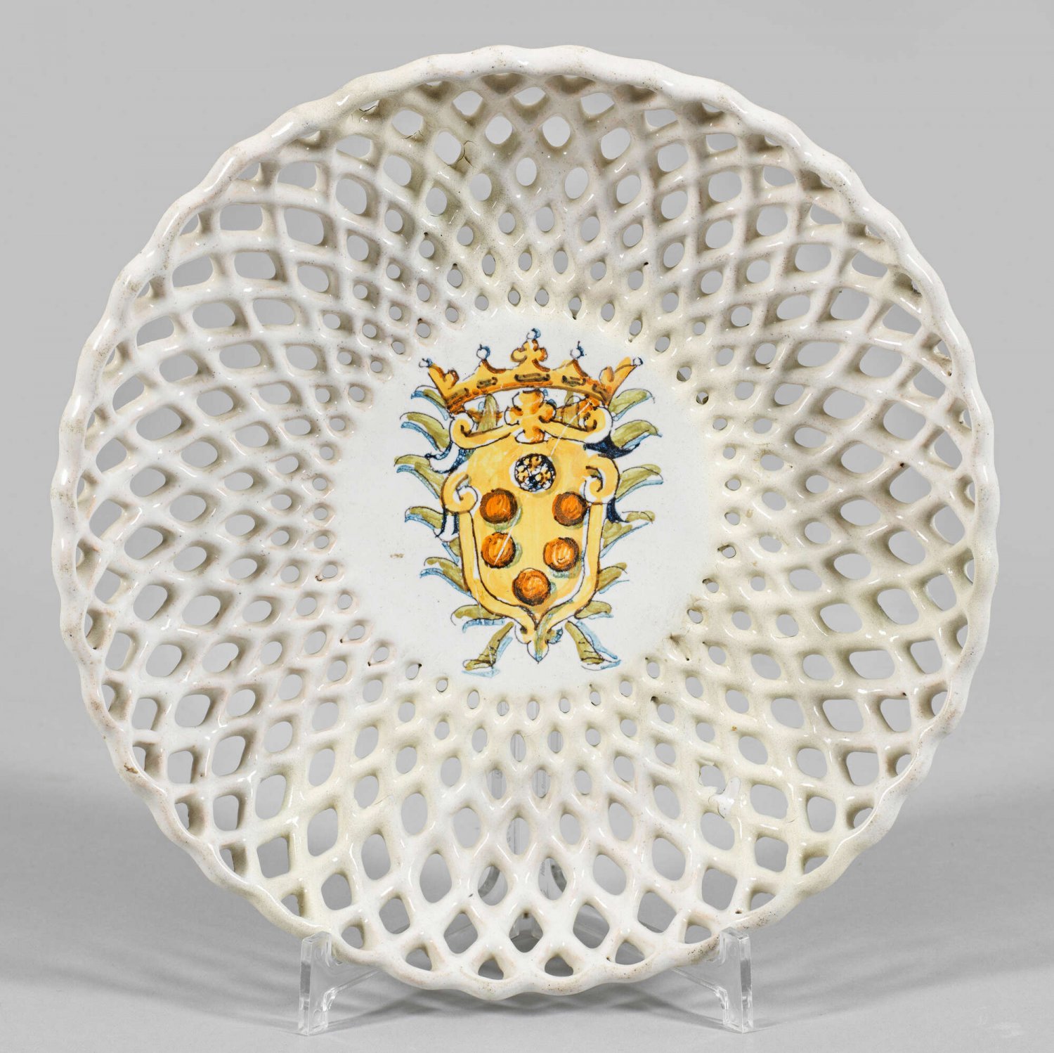 Majolika-Durchbruchschale mit Medici-Wappen Gemuldete Schale auf ausgestelltem Standring, im flachen Spiegel das Wappen der Medici in polychromer Scharffeuermalerei. Rest.; D. 28,8 cm.