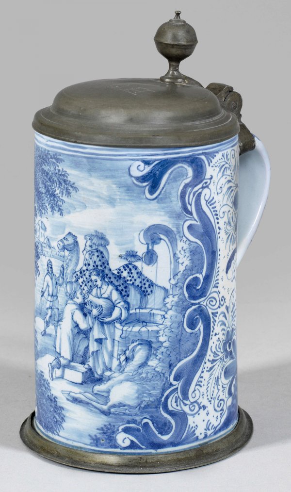A Nuremberg faience pewter-mounted and lidded tankard with light blue glaze and blue painted decoration of Rebecca and Eliezer at the Well. Restored.