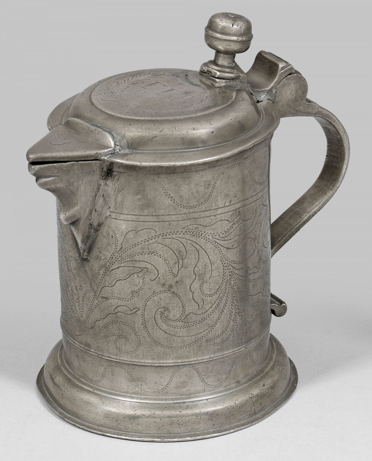Deckelhumpen Zinn. Über wulstartigem Stand hoher, zylindrischer Korpus mit tief angesetztem Schnabelausguss und geflecheltem Floraldekor. Gewölbter Deckel mit Ausgussabdeckung, mittig bekränztes Monogramm, dat. 1716. Bandhenkel. Rest.; H. 19,5 cm.