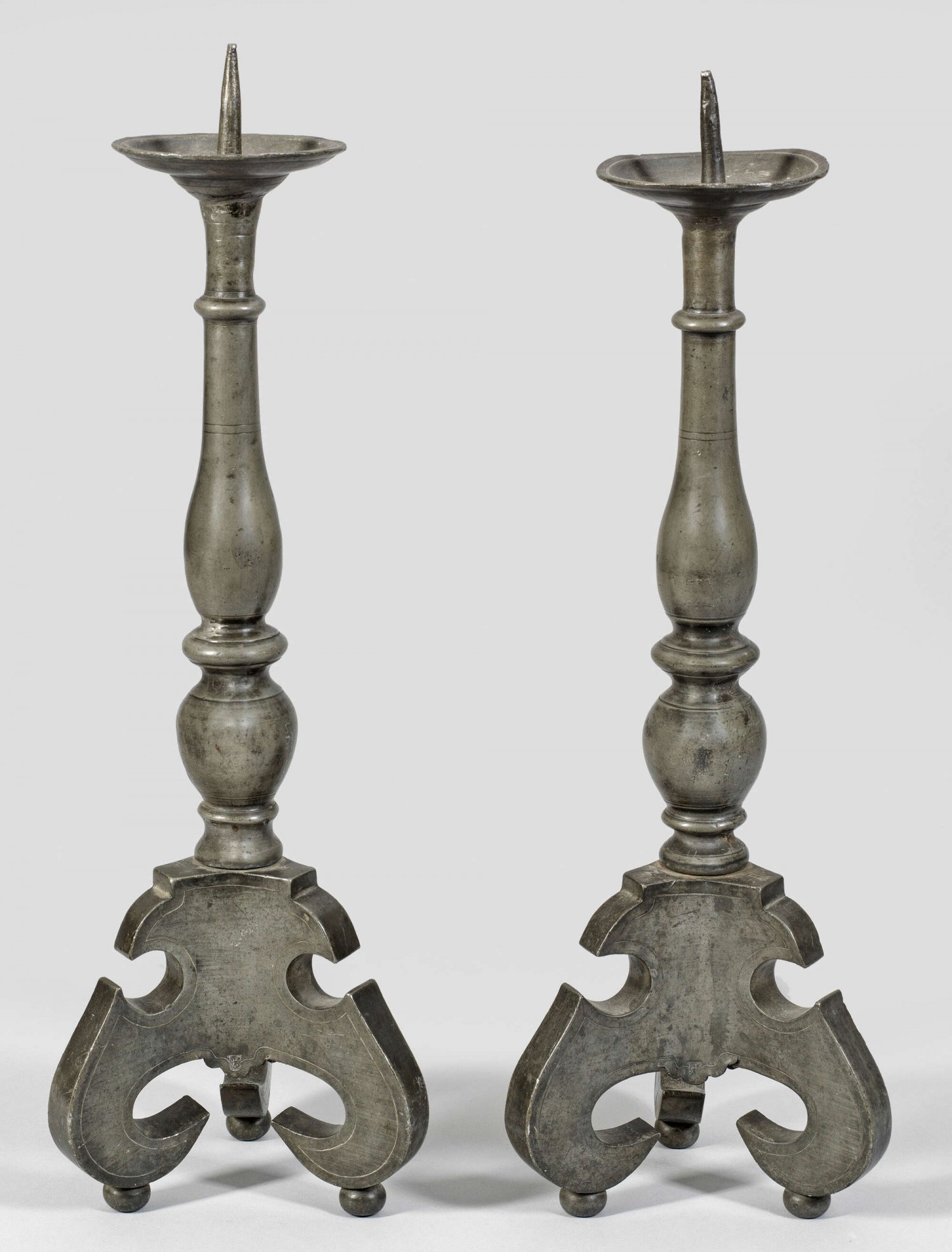 Paar große seltene Aaalener Barock-Leuchter 1-flg.; Zinn. Von Kugelfüßen getragener, dreiseitiger, geschweifter Stand, reich gegliederter Balusterschaft, flach gemuldete Traufschale mit zentralem Dorn. Monogr. "CC" und nummeriert "2 B" bzw. "3 B". Gem.; Stadtmarke, Meister Johann Ruland Roschmann der Ältere (1756 - 1812, wird um 1782 Meister in Aalen.) 57,5 cm-58,5 cm.