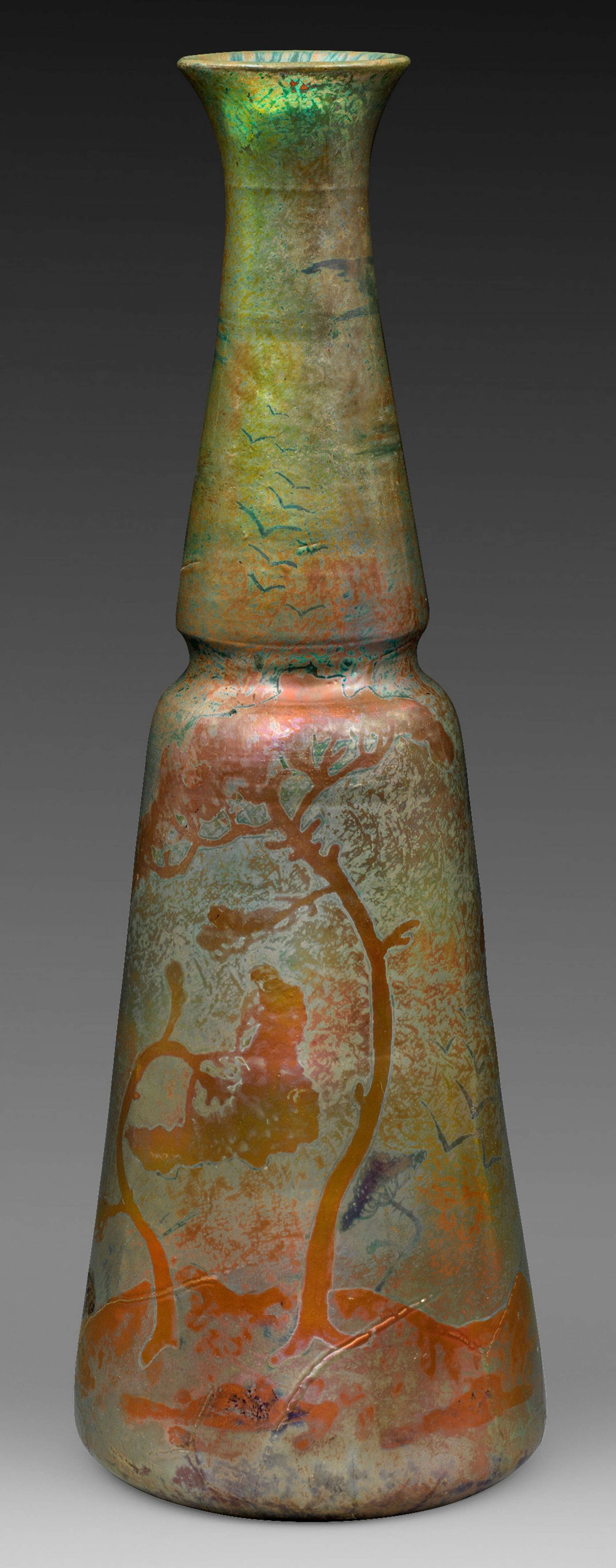 Große Jugendstil-Vase mit Landschaft von Dominique Zumbo Keramik. Schlanke, konische, im oberen Drittel eingeschnürte Form mit ausschwingendem Rand. Seidenmatte Lüsterglasur in grünlichen, bläulichen und purpurfarbenen Tönen, gemalter Lüsterdekor aus einer südfranzösischen Landschaft mit Pinien und Vögeln. Sign. mit Pinsel-Marke "Dominique (/) Zumbo (/) arènes (/) Fréjus Var". H. 60 cm.