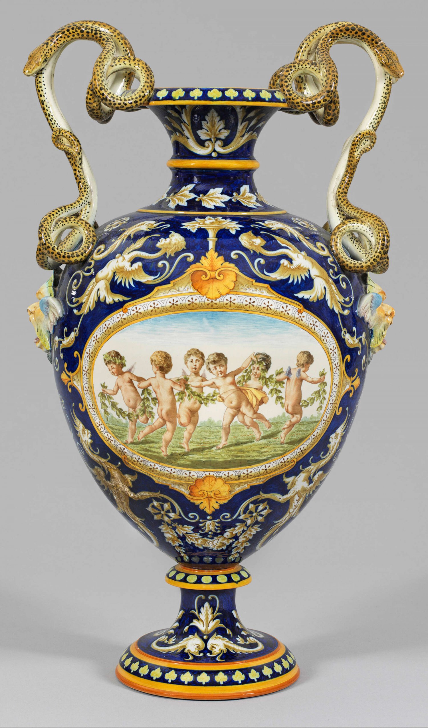 Sehr große Ginori-Schlangenhenkelvase im Urbino-Stil Majolika. Ausgestellter Glockenfuß, spitzovoider Korpus, verengter Hals, die beiden Henkel jeweils aus zwei verschlungenen Schlangen, unterhalb der Ansätze geflügelte Maskarons. Reicher, polychromer Scharffeuerdekor, in zwei großen Ovalreserven tanzenden Putti bzw. Landschaft, der dunkelblaue Fond mit Ornamenten und Grotesken. Manufakturmarke mit Modell- bzw. Dekor-Nr. "13-887" H. 73,5 cm.