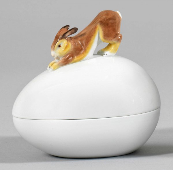Weißporzellan. Ovoide, tief gemuldete Form mit aufgewölbtem Deckel, mittig figürlicher Knauf in Gestalt eines sich streckenden Hasen. Polychrome Malerei. Entw. Max Blochmann, um 1905 - 1910. Limitierte Auflage 040/100. Jahreszeichen. Schwertermarke mit Goldsignet. H. 13 cm. 14,5 cm x 10,5 cm.